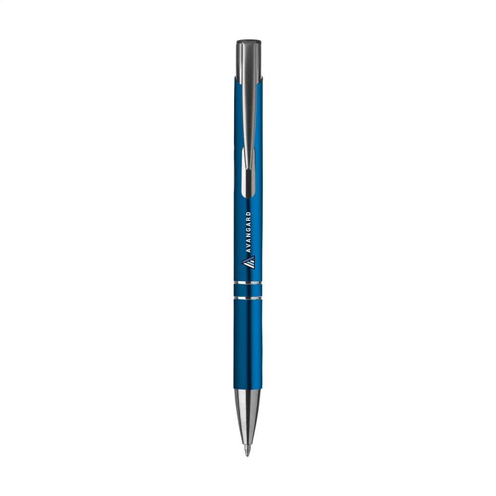 Blauwschrijvende óf zwartschrijvende, aluminium balpen met matgekleurde houder in metallic look en metalen clip.Drukoppervlak: