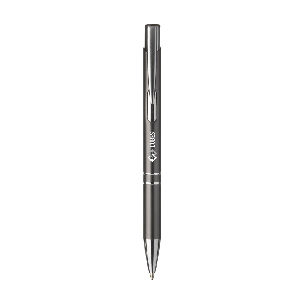 Blauwschrijvende óf zwartschrijvende, aluminium balpen met matgekleurde houder in metallic look en metalen clip.Drukoppervlak: