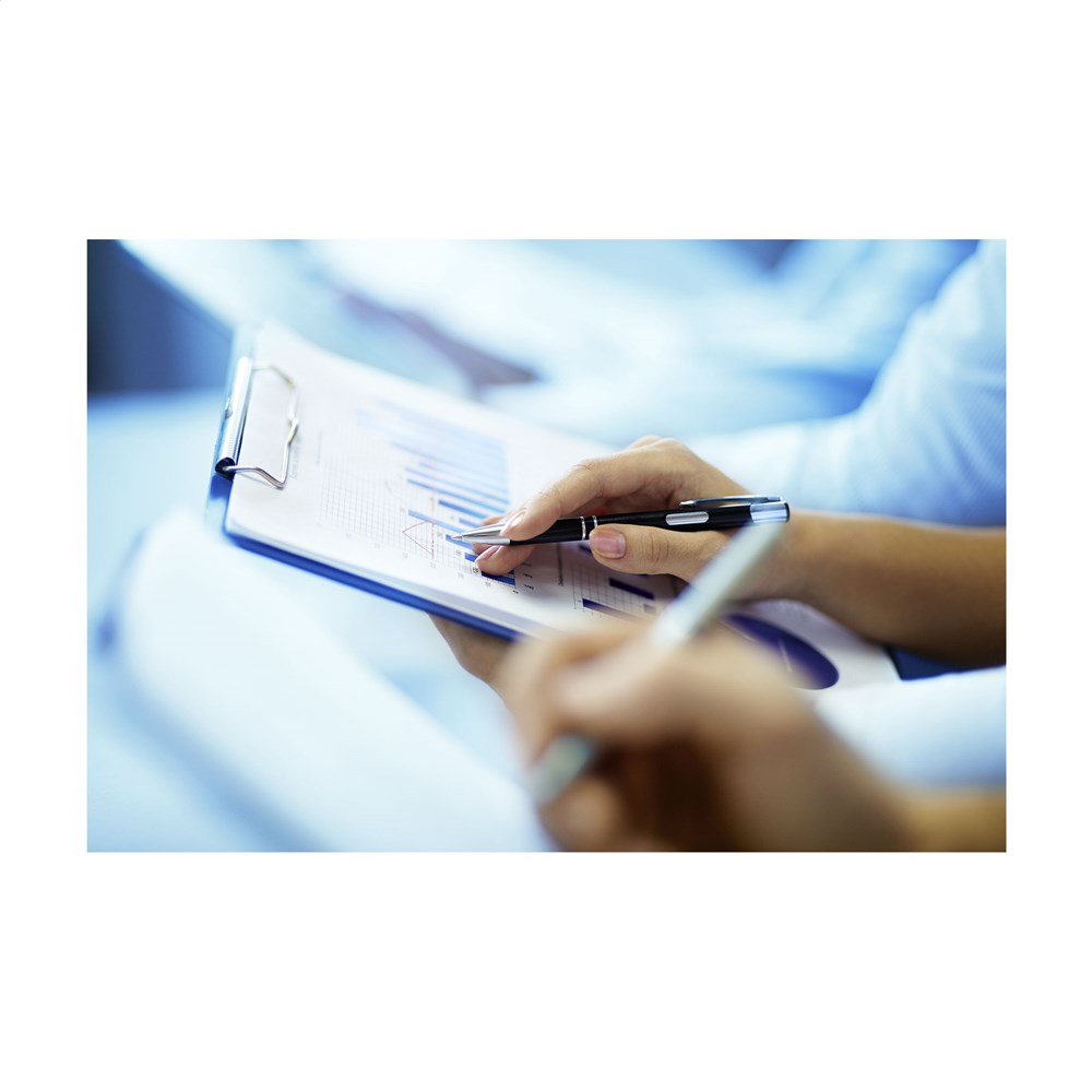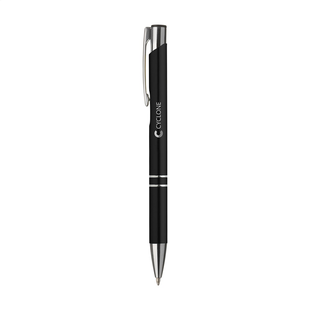 Blauwschrijvende óf zwartschrijvende, aluminium balpen met matgekleurde houder in metallic look en metalen clip.Drukoppervlak: