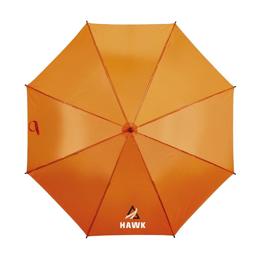 Paraplu met automatische telescoopvering. 190T polyester bespanning, glasvezel frame, metalen steel, soft foam handgreep en klittenbandsluiting.Drukoppervlak: