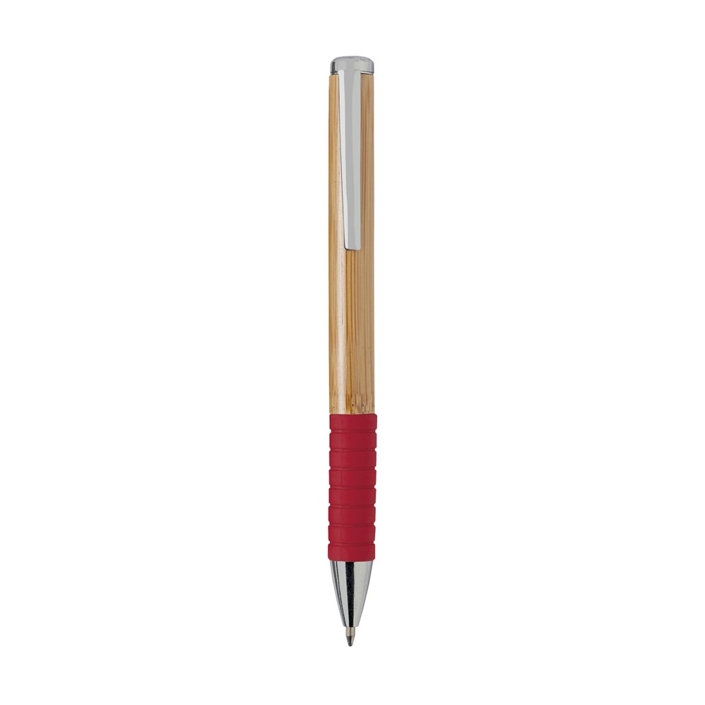 Blauwschrijvende balpen met bamboe houder, metalen clip, draaikliksysteem en gekleurd rubberen, gripvast voorstuk.Drukoppervlak: