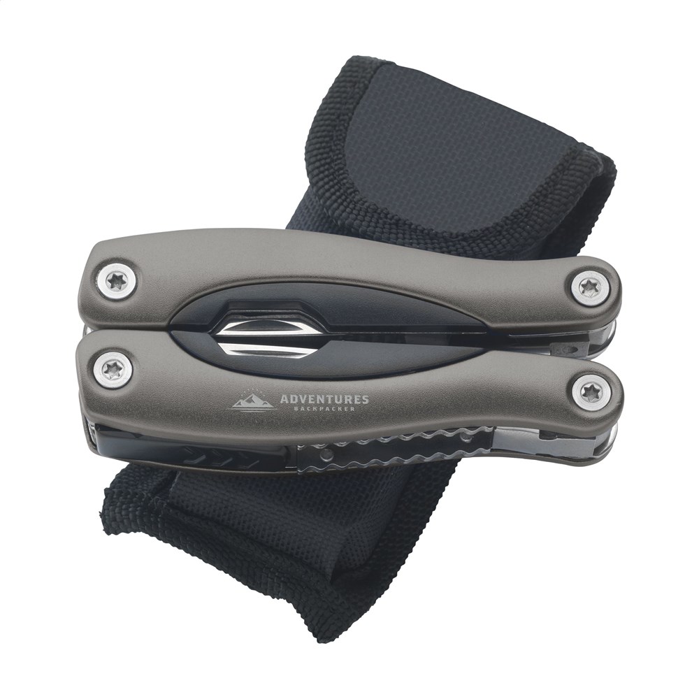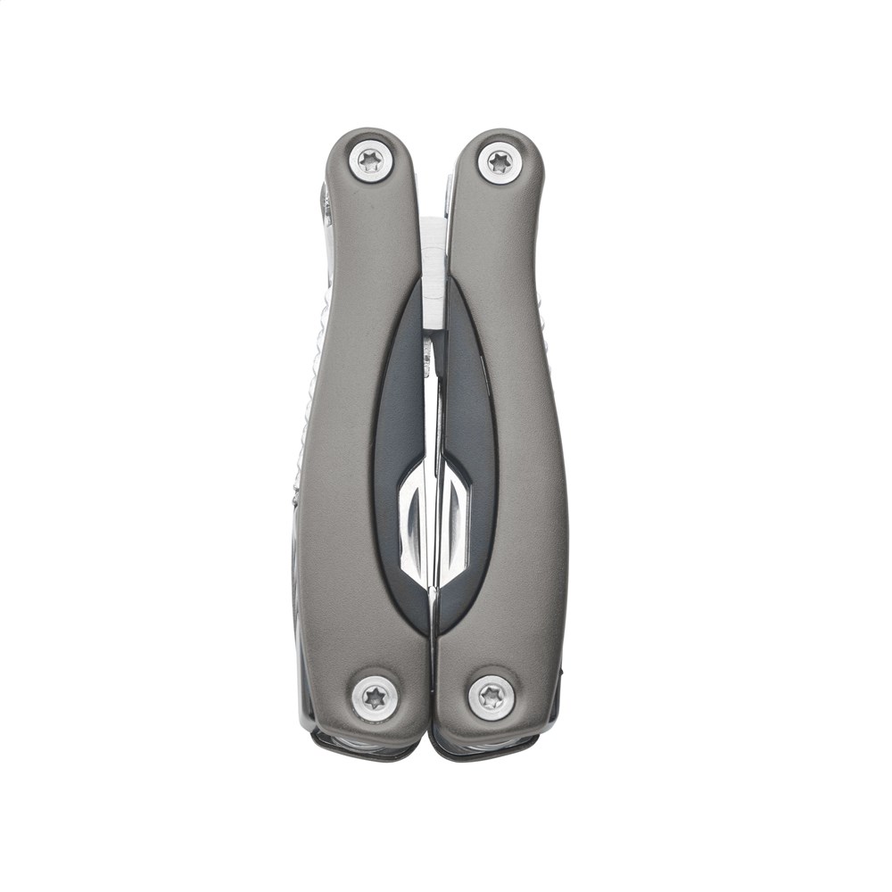 Compacte RVS multitang met aluminium handgreep in metallic look. 9-delig met 13 functies: tang, draadknipper, 3 schroevendraaiers, philips kruiskopschroevendraaier, vijl, zaag/visschraper, mes, priem, blikopener, flesopener. In 600D nylon etui. Op het bezit en/of dragen van messen of multitools in het openbaar kunnen lokale regels van toepassing zijn. Per stuk in doosje.