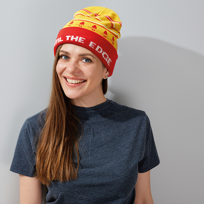 Dubbellaagse beanie van acryl. Volledig naar wens op te maken in maximaal 6 kleuren.