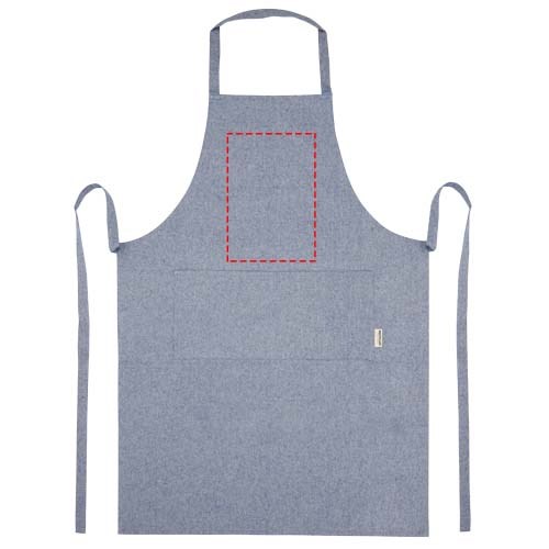 Schort gemaakt van een mix van gerecycled katoen en polyester van 200 g/m². Beschikt over 2 aangrenzende zakken met een gecombineerde afmeting van 45 x 20 cm en een bandsluiting van 1 meter aan de achterkant. Gerecycled katoen wordt vervaardigd uit voor consumenten bestemd afval dat in textielfabrieken tijdens het snijproces wordt geproduceerd. Vanwege de aard van gerecycled katoen, kan er sprake zijn van een zeer lichte kleurvariatie. Dit kenmerkt draagt duidelijk bij aan een authentiekere uitstraling. Lengte van de nekband: 55 cm.Drukoppervlak: