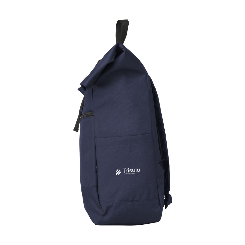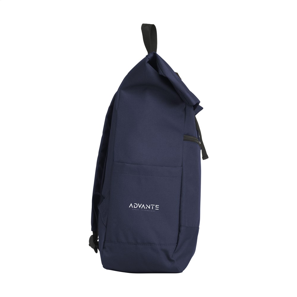 WoW! Praktische, stevige en waterafstotende ‘roll-top’ rugzak van RPET Polyester (gemaakt van gerecyclede PET-flessen). De rugzak heeft een groot binnenvak met speciaal laptopcompartiment (tot 15.4 inch). Ritsvak aan de voorzijde met daaronder een reflecterend accent (wat de zichtbaarheid in het donker verbetert). Met 2 zijvakken, foam rugzijde en gewatteerde, verstelbare schouderriemen voor meer draagcomfort, draaglus en handige rolsluiting met kliksysteem aan de bovenzijde. De perfecte tas, met een minimale ecologische footprint, voor dagelijks gebruik. Inhoud ca. 20 liter.Drukoppervlak: