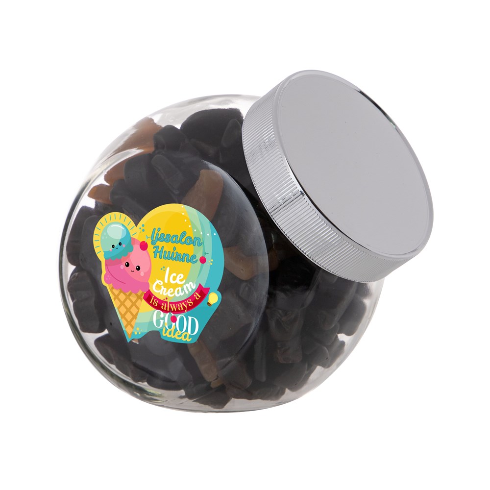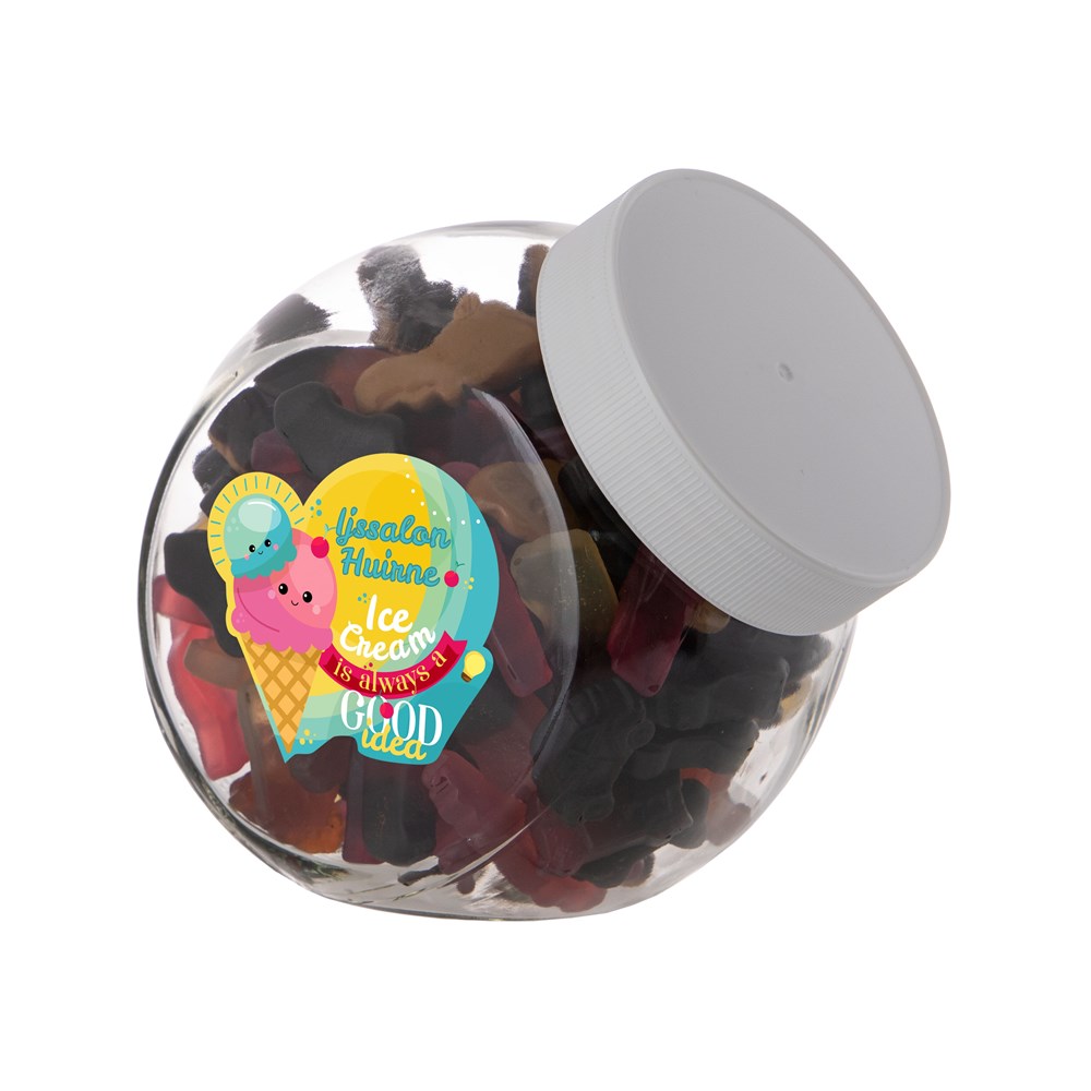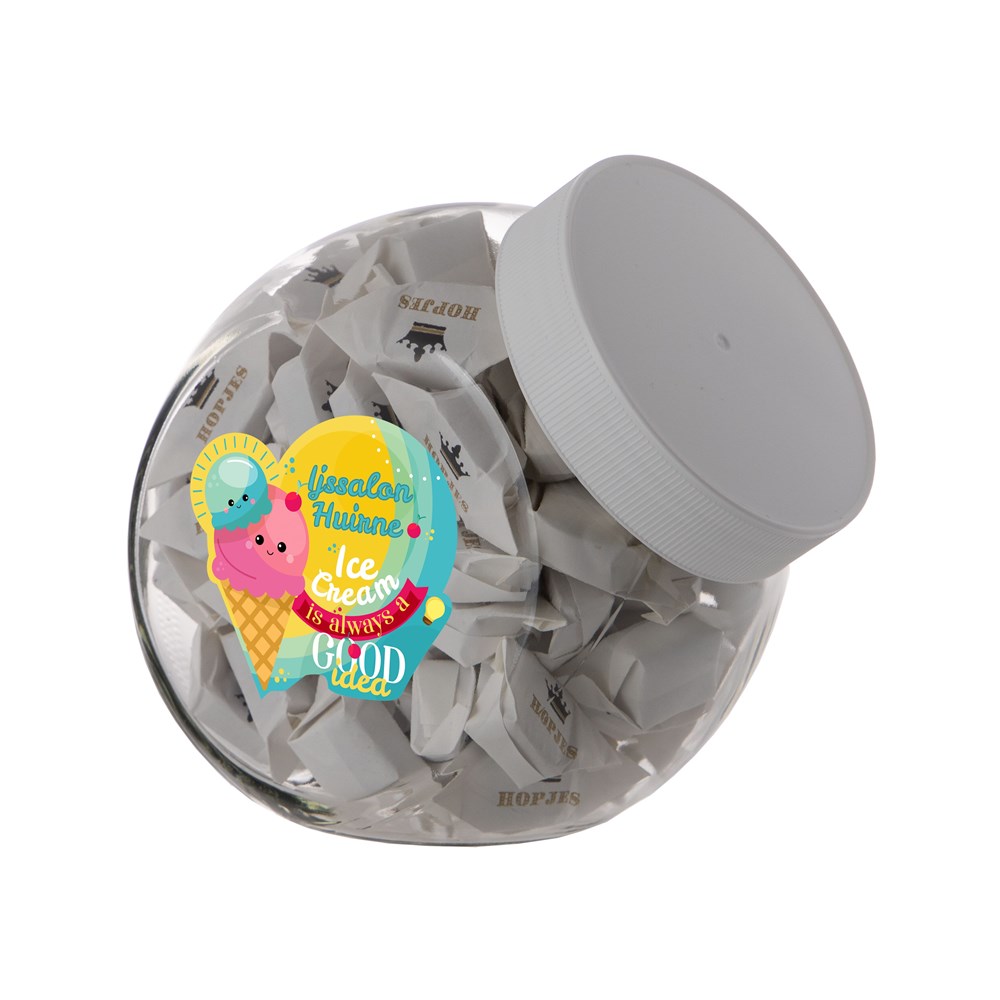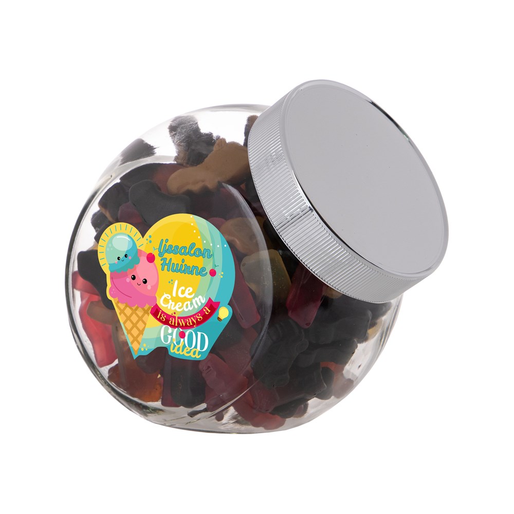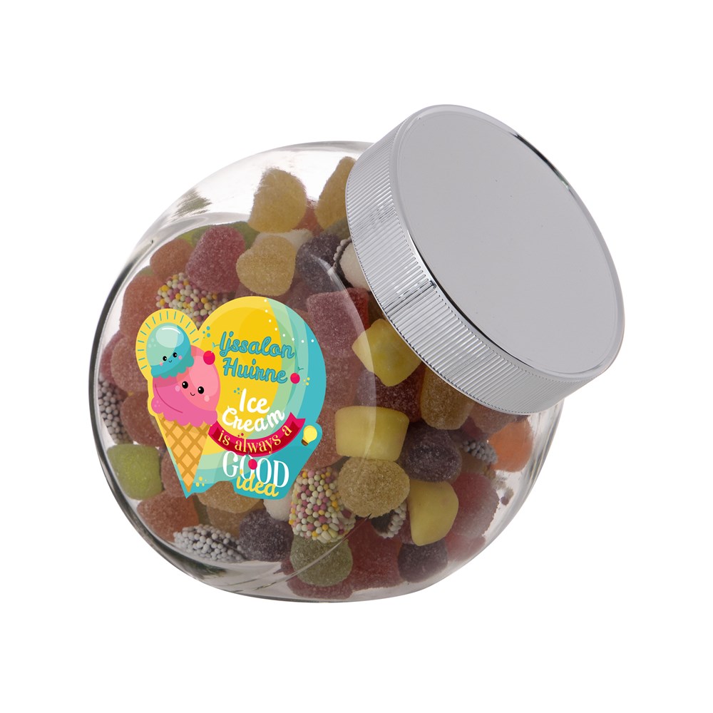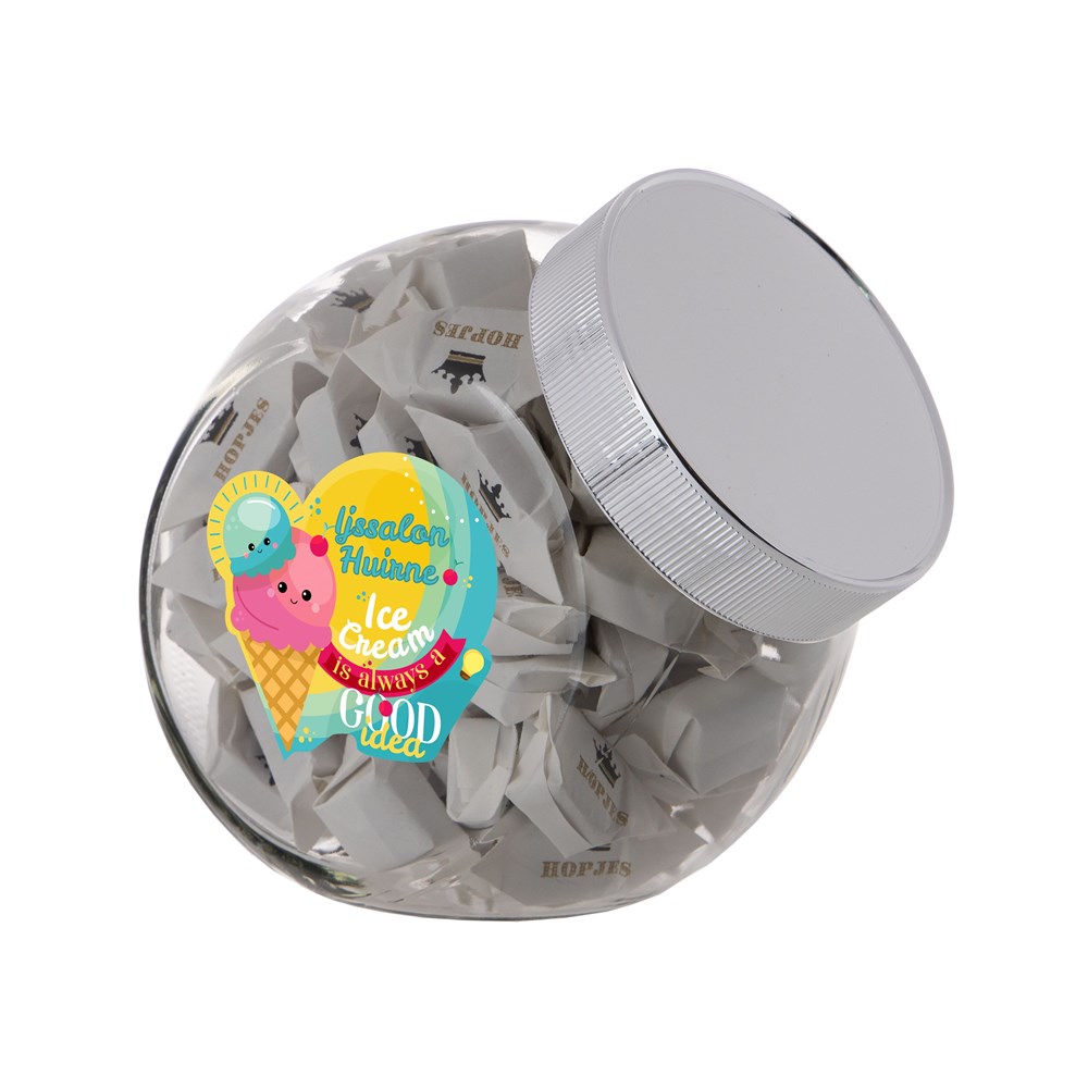 Glazen pot 0,9 liter voorzien van een full colour sticker op beide zijden, gevuld met snoepDrukoppervlak: