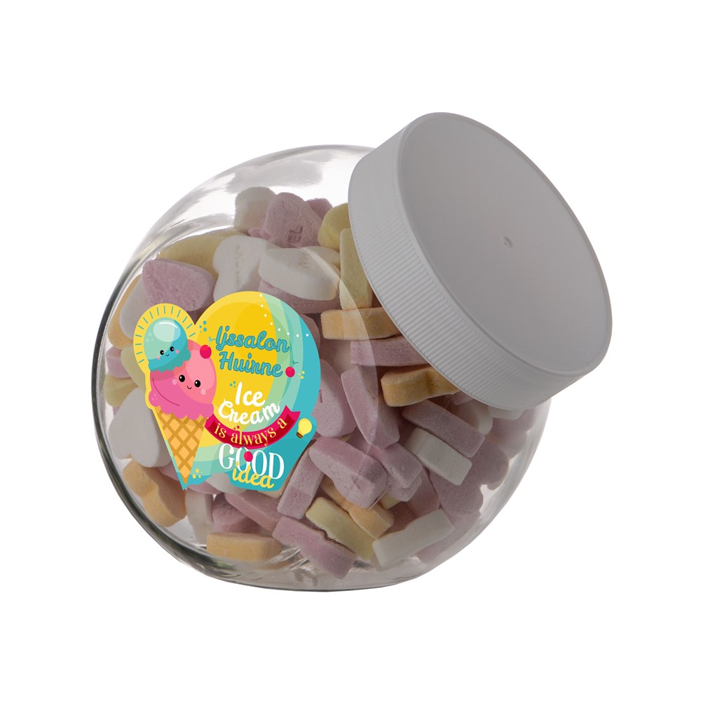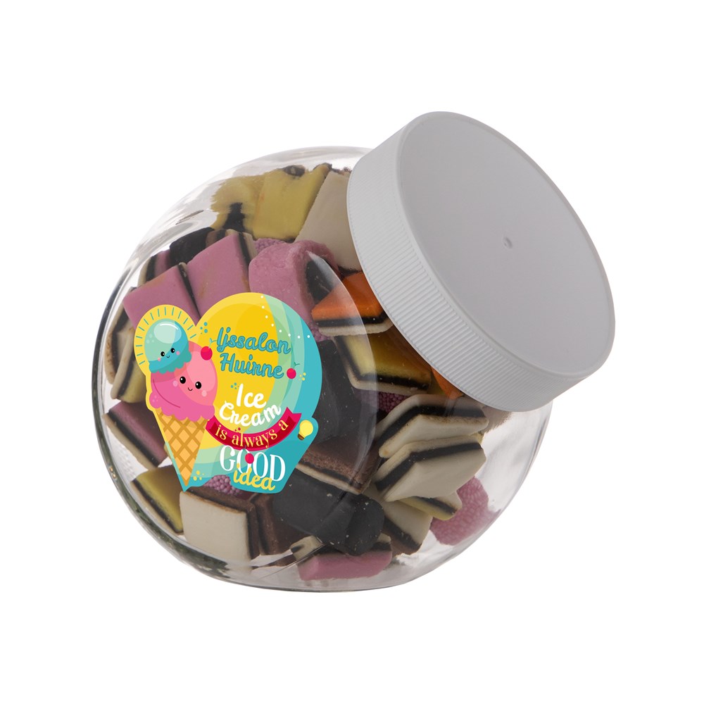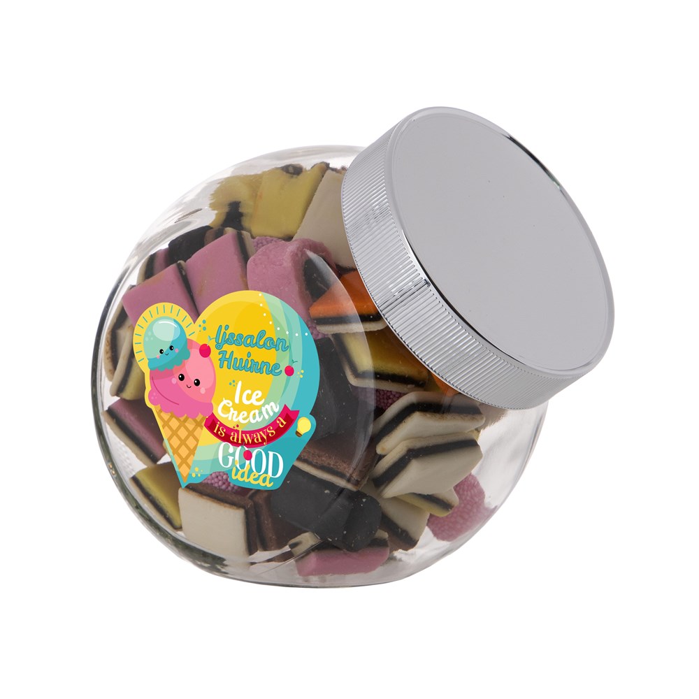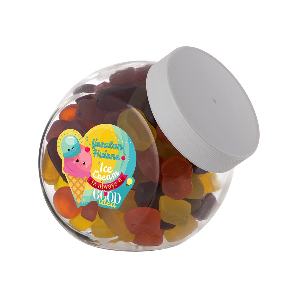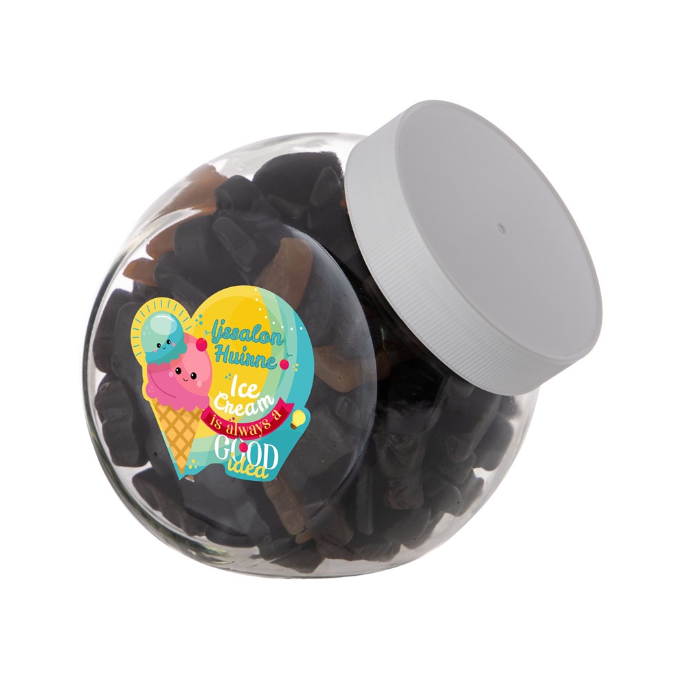 Glazen pot 0,9 liter voorzien van een full colour sticker op beide zijden, gevuld met snoepDrukoppervlak: