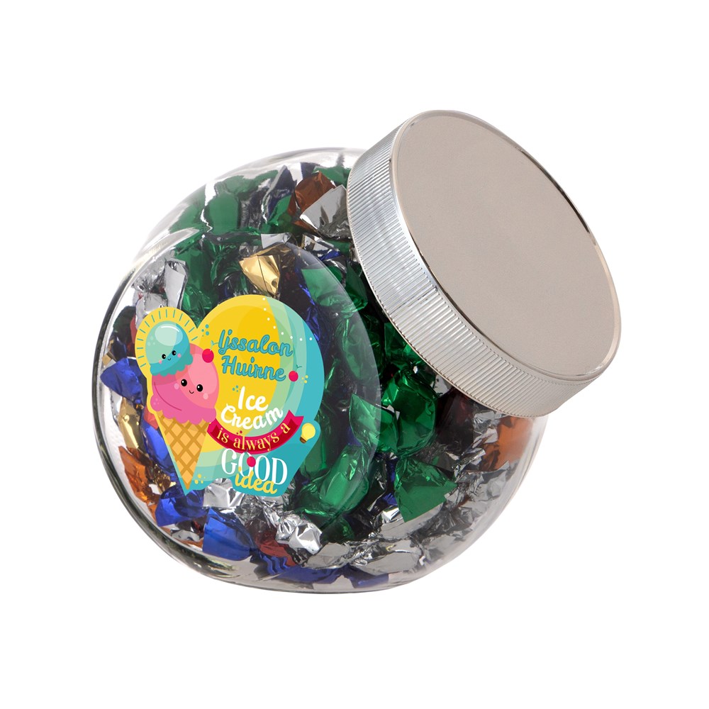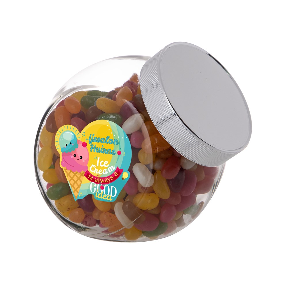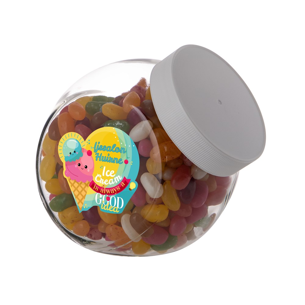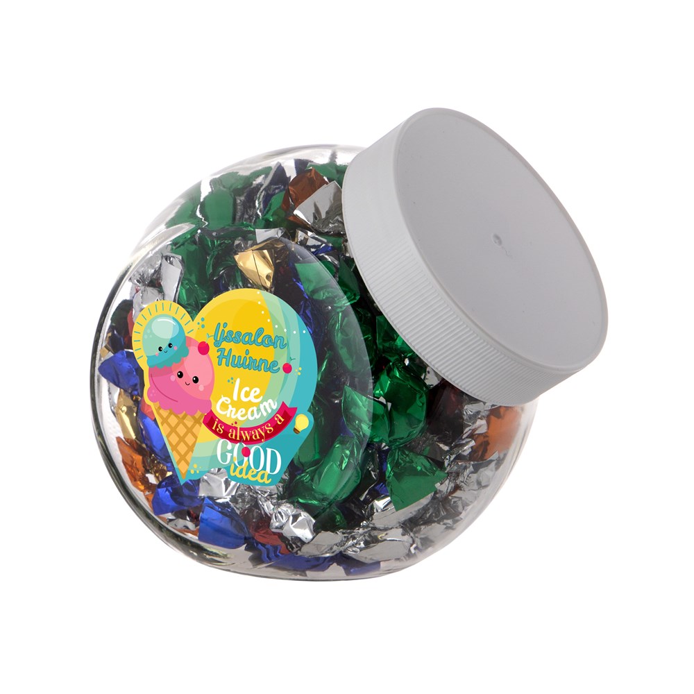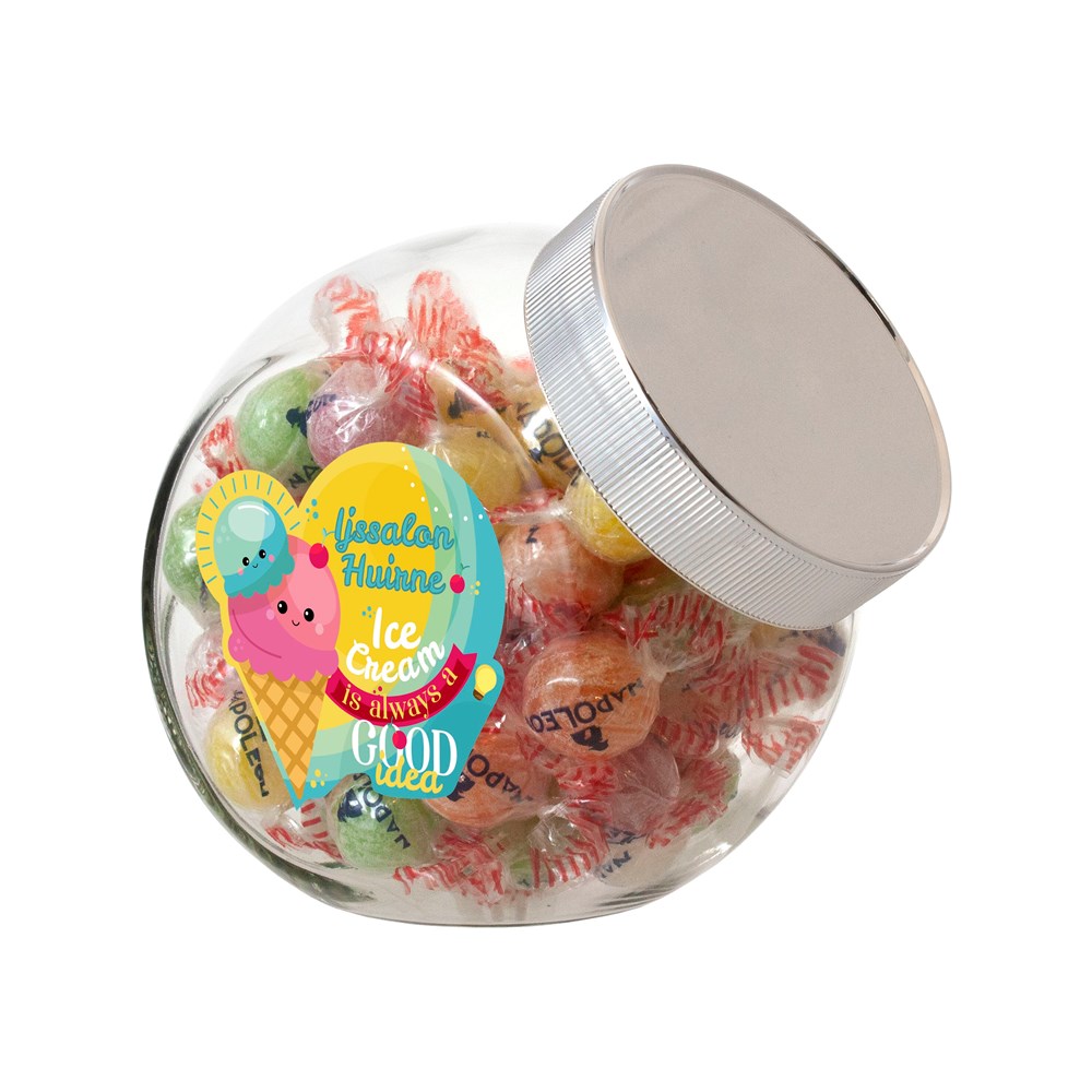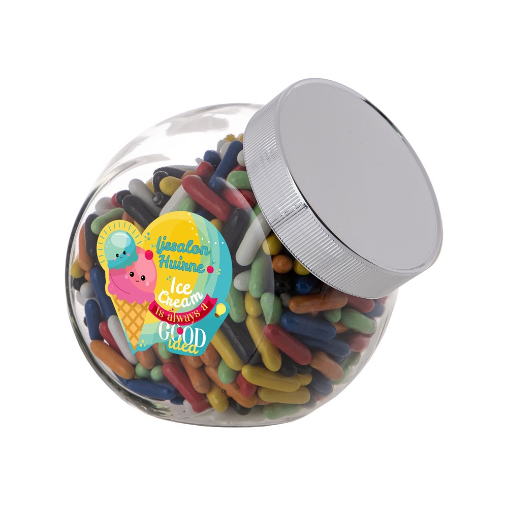 Glazen pot 0,9 liter voorzien van een full colour sticker op beide zijden, gevuld met snoepDrukoppervlak: