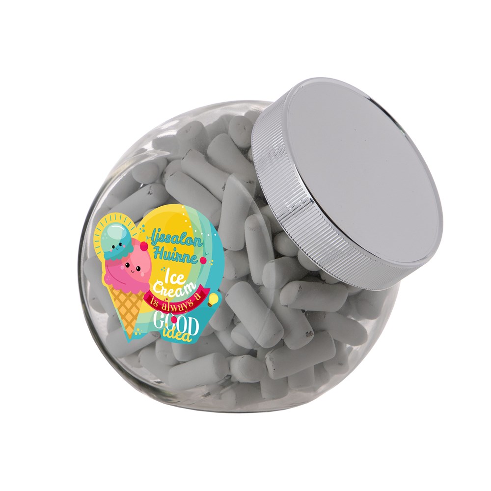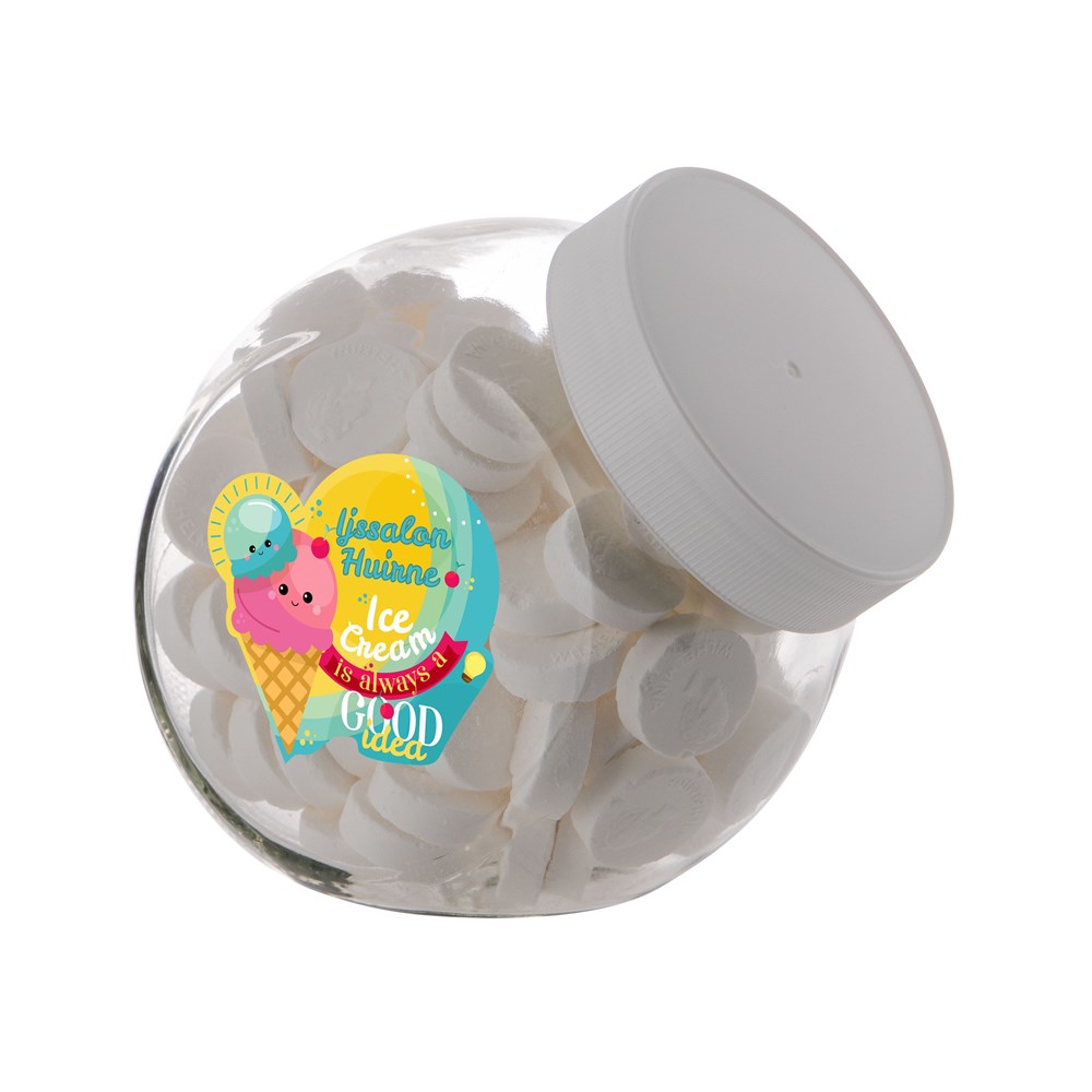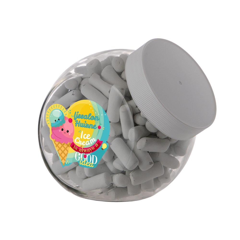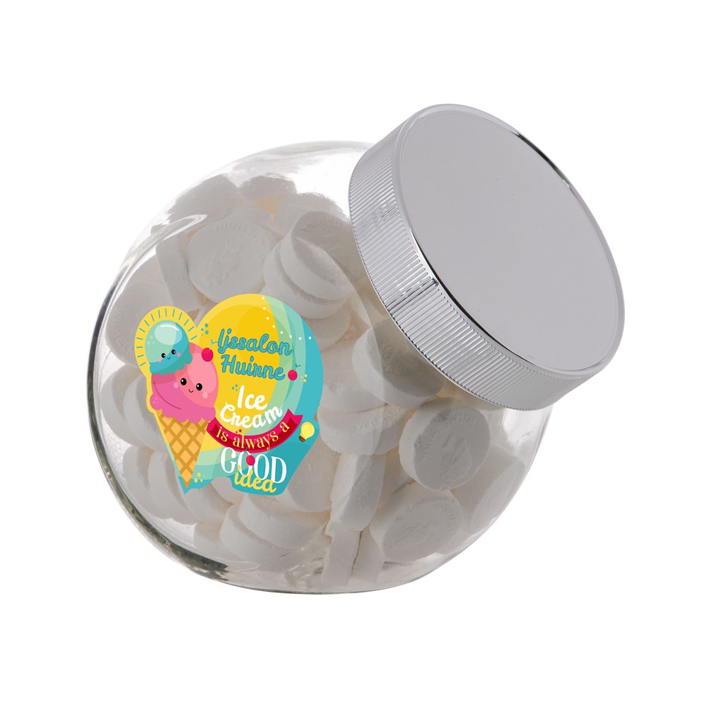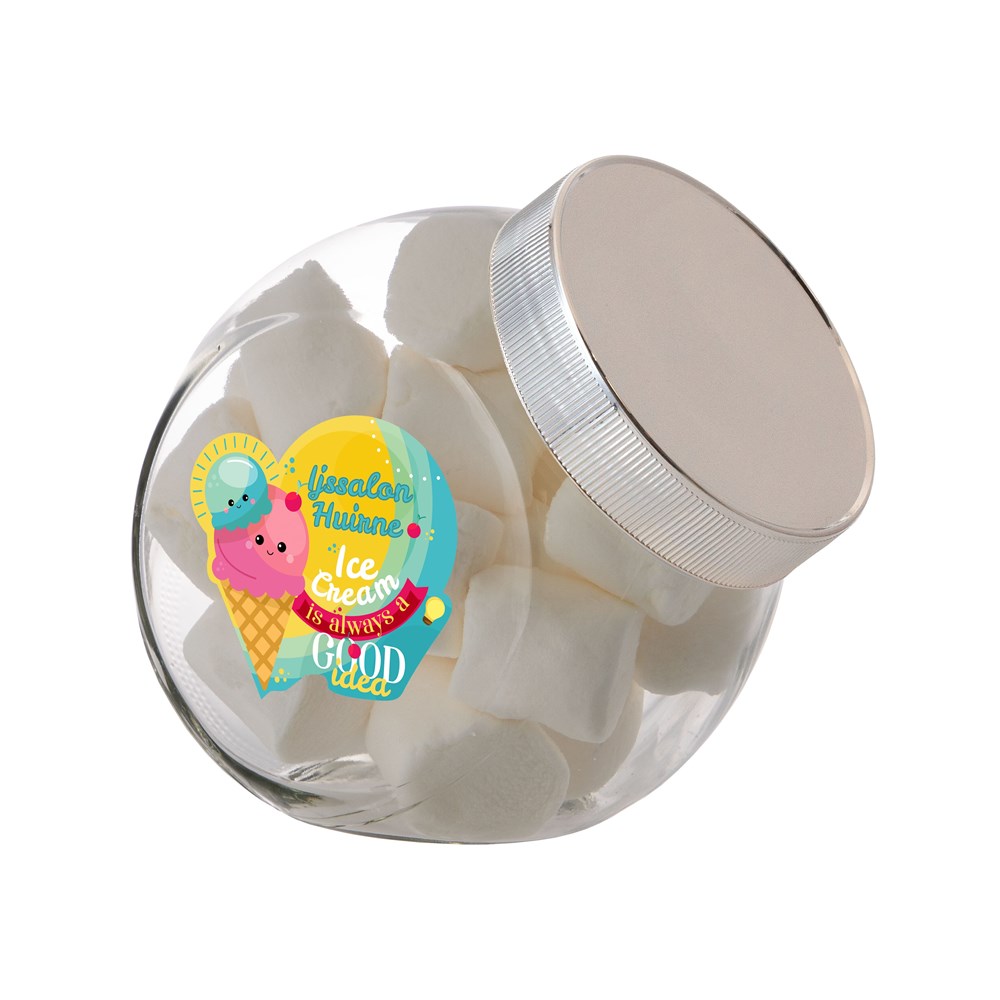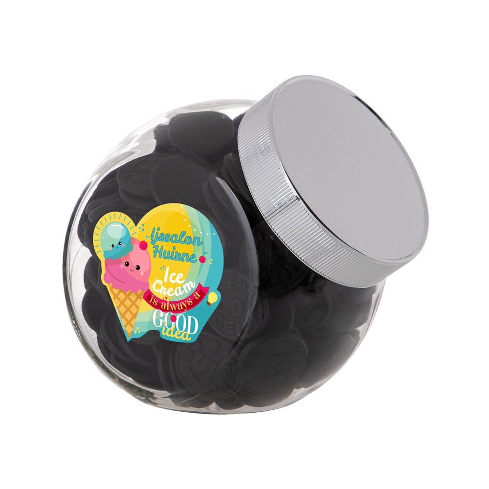 Glazen pot 0,9 liter voorzien van een full colour sticker op beide zijden, gevuld met snoepDrukoppervlak: