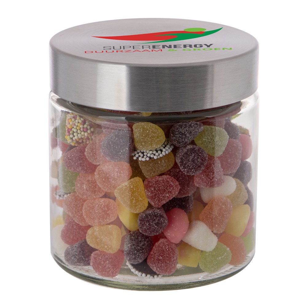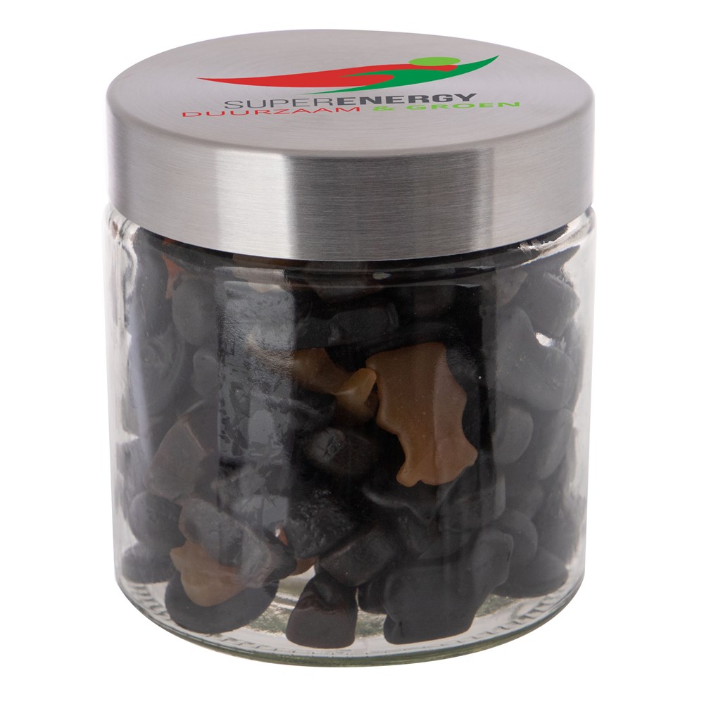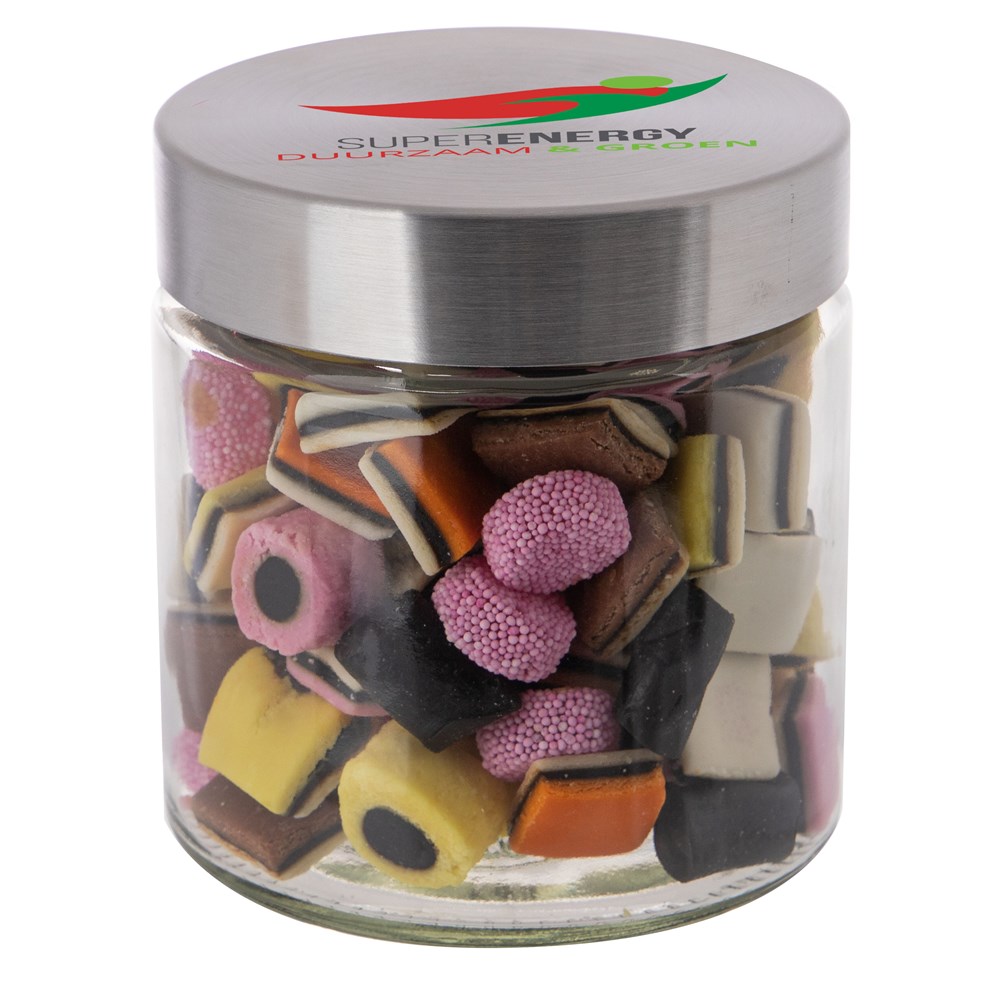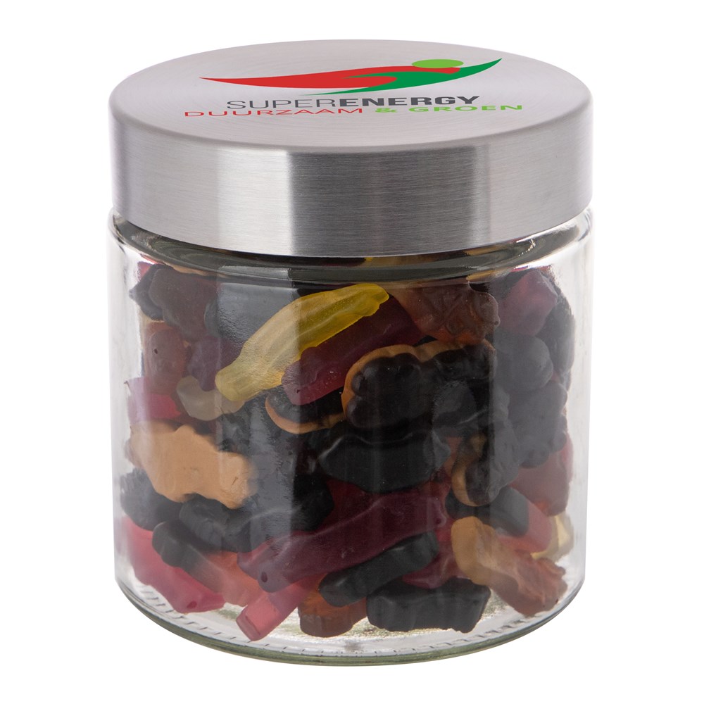 Met zijn hoogwaardige glazen design en RVS deksel straalt deze pot klasse en stijl uit. Het deksel wordt voorzien van een full colour bedrukking en de pot zelf wordt gevuld met het heerlijkste snoepgoed.
