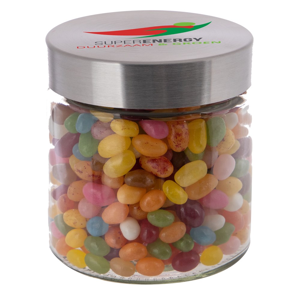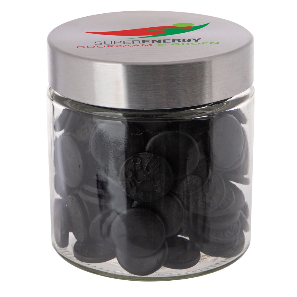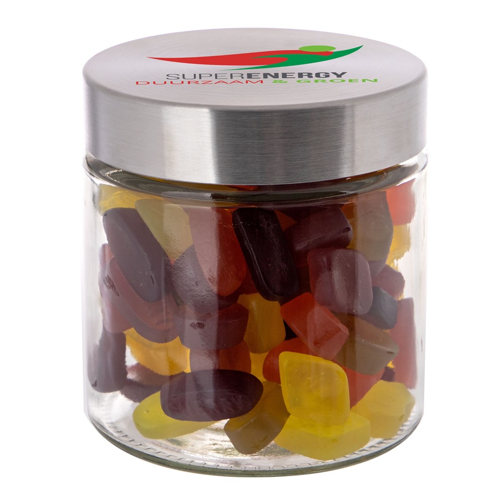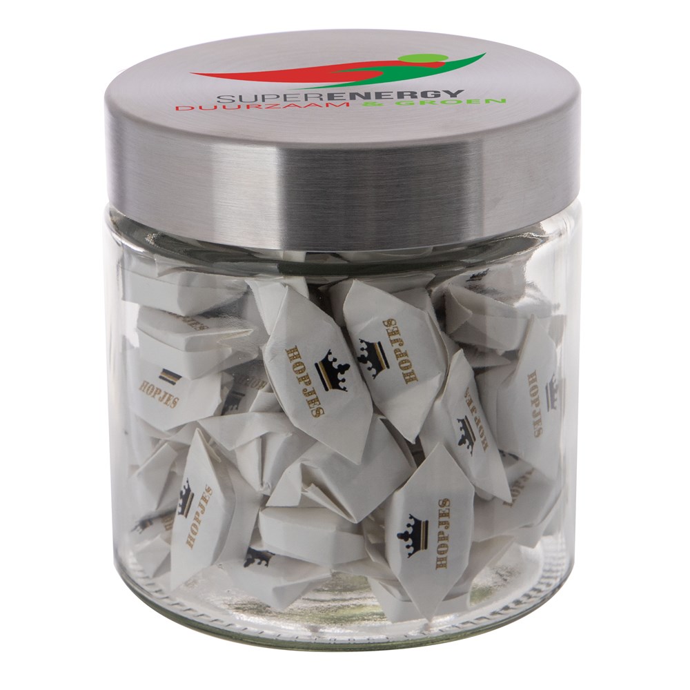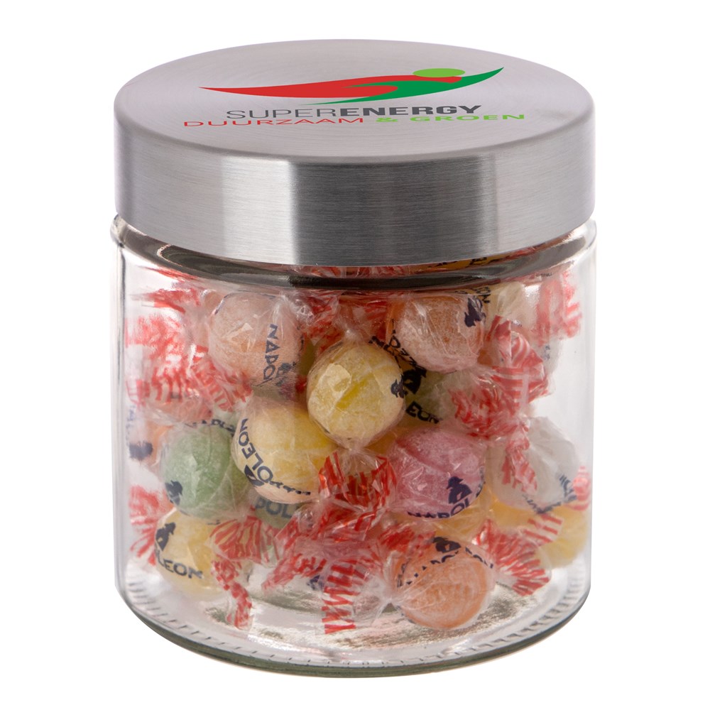 Met zijn hoogwaardige glazen design en RVS deksel straalt deze pot klasse en stijl uit. Het deksel wordt voorzien van een full colour bedrukking en de pot zelf wordt gevuld met het heerlijkste snoepgoed.