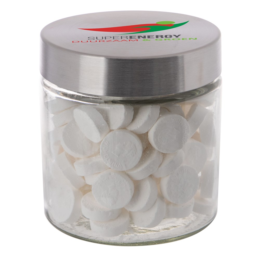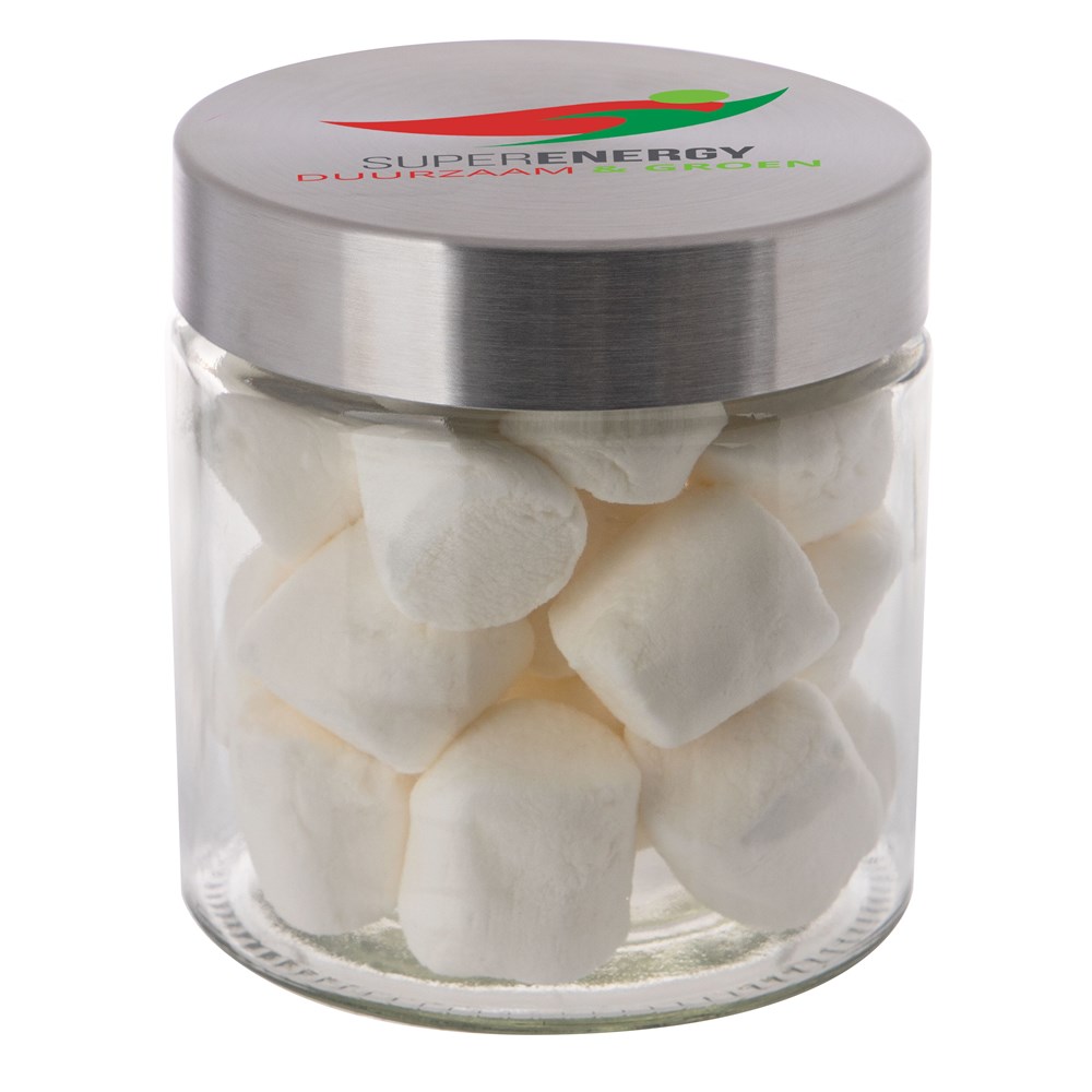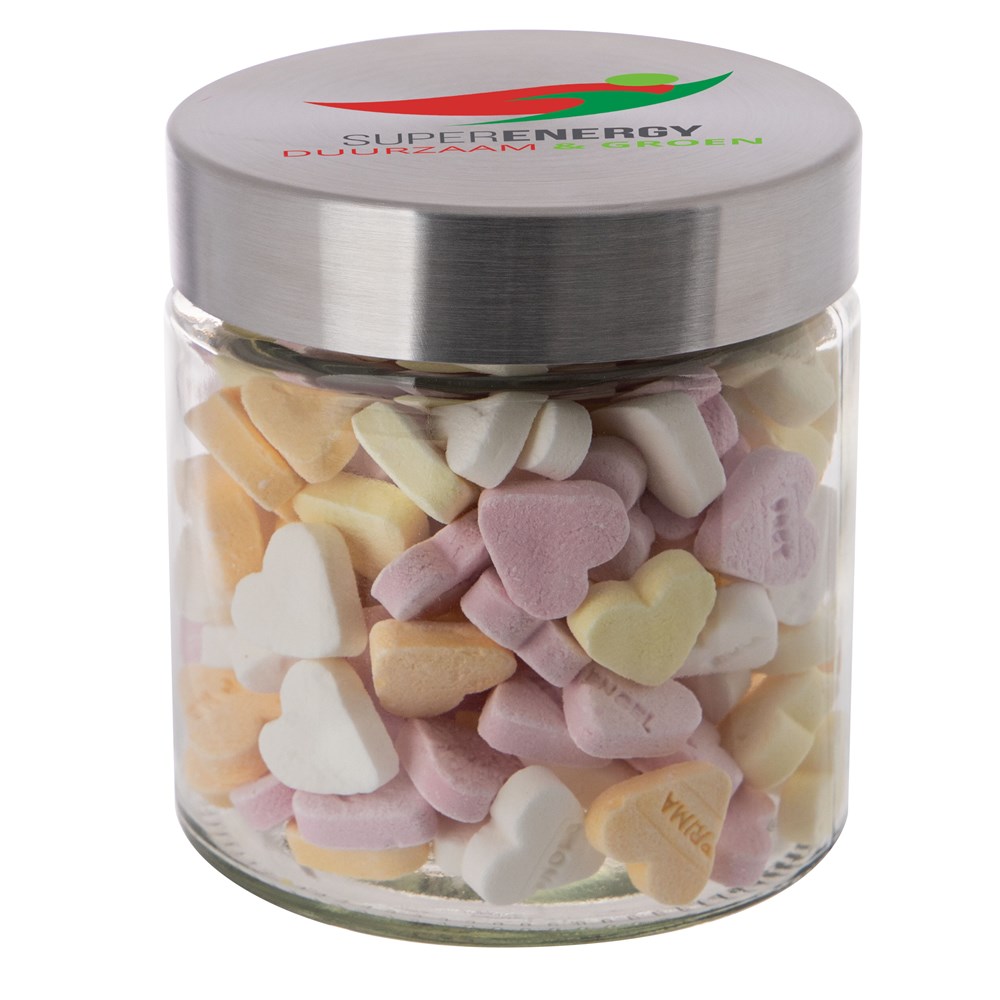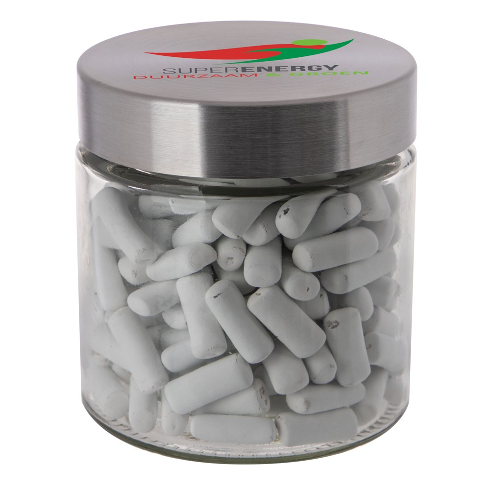 Met zijn hoogwaardige glazen design en RVS deksel straalt deze pot klasse en stijl uit. Het deksel wordt voorzien van een full colour bedrukking en de pot zelf wordt gevuld met het heerlijkste snoepgoed.