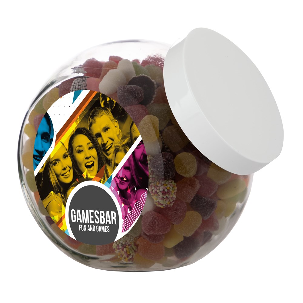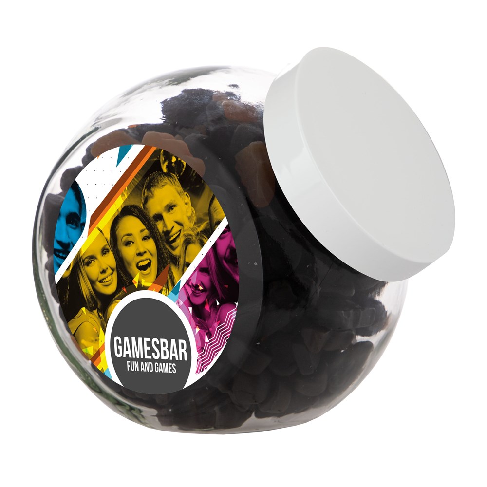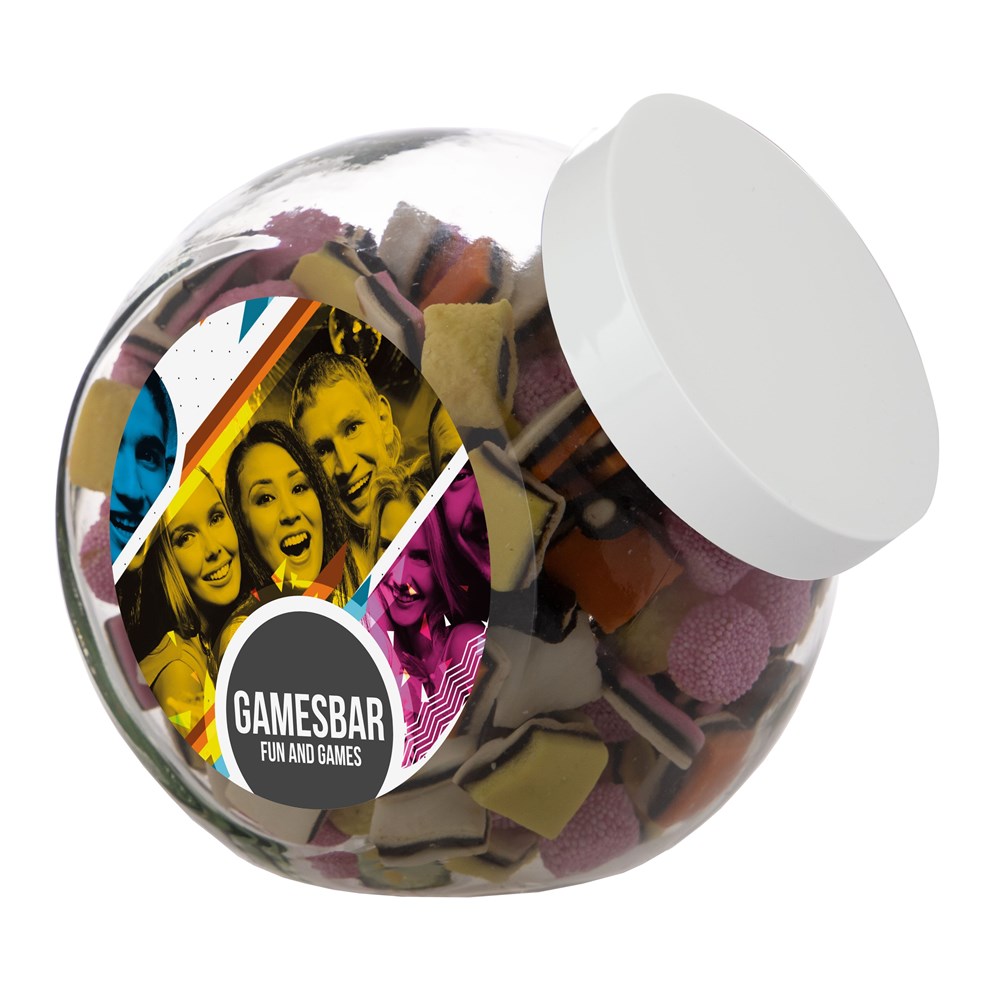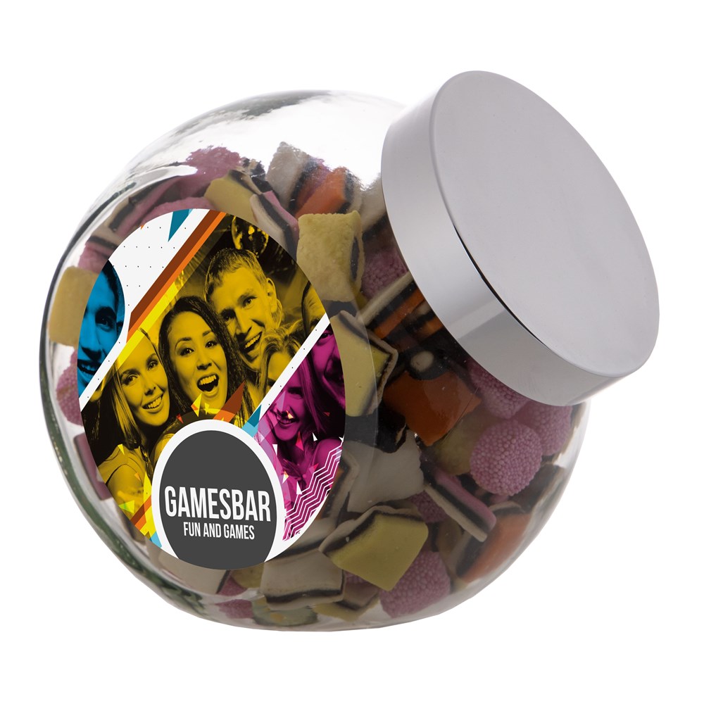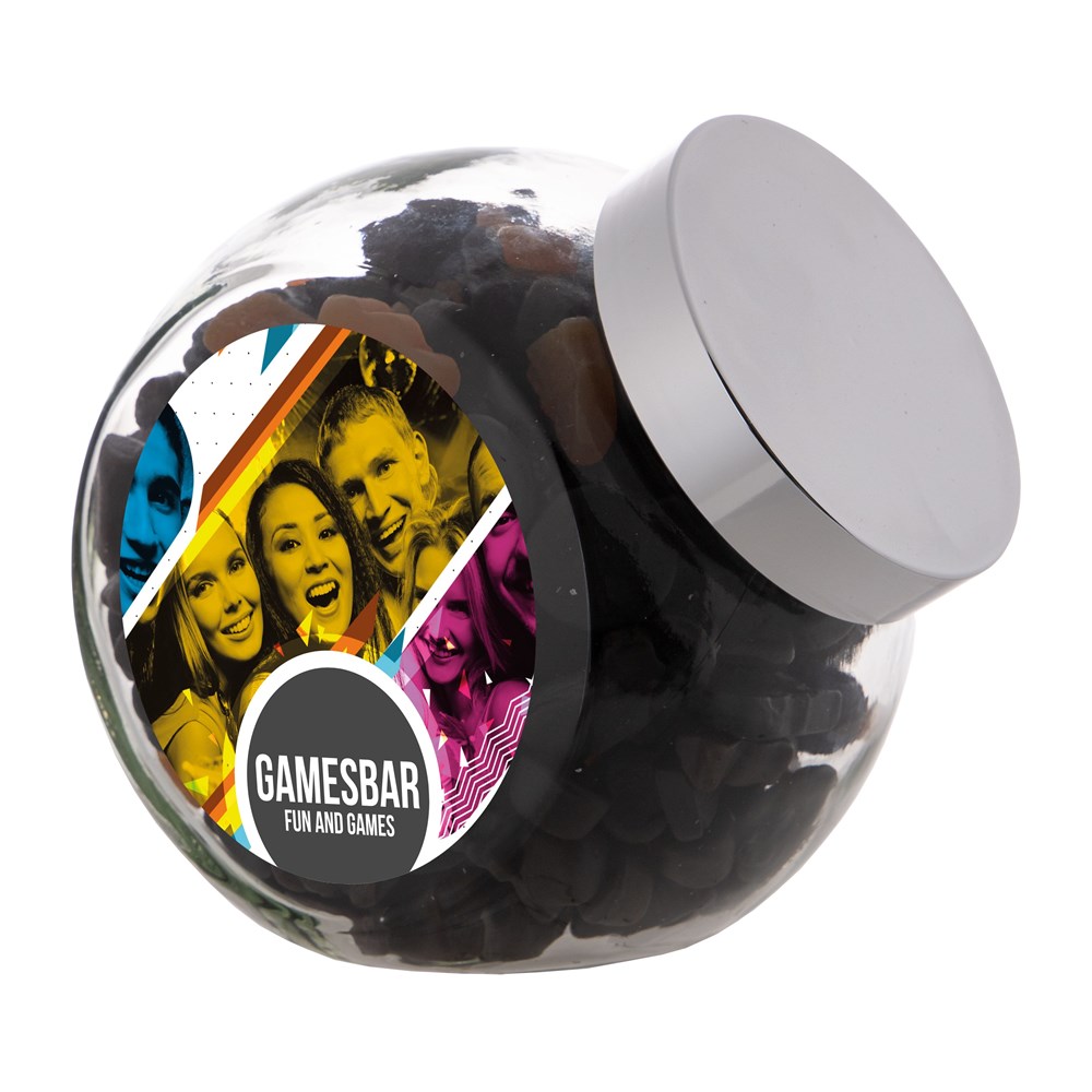 Grote glazen pot 2 liter voorzien van een full colour sticker op beide zijden, gevuld met snoepDrukoppervlak: