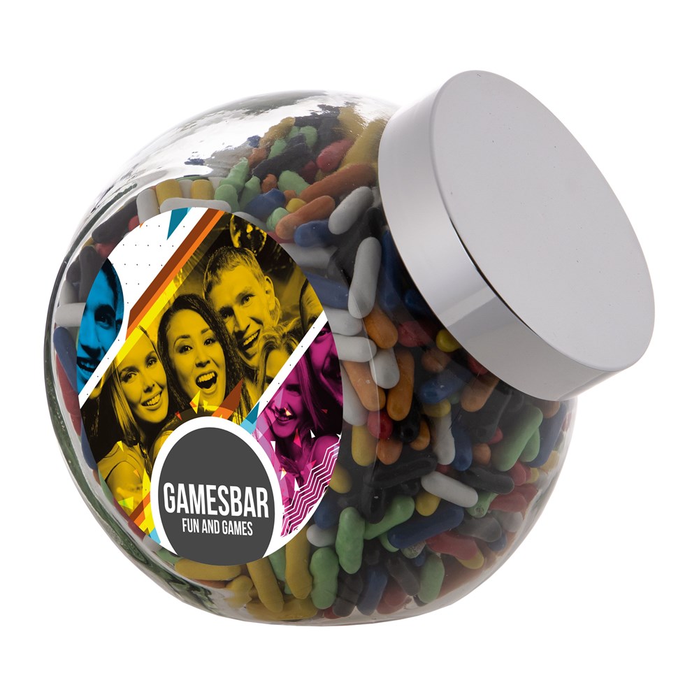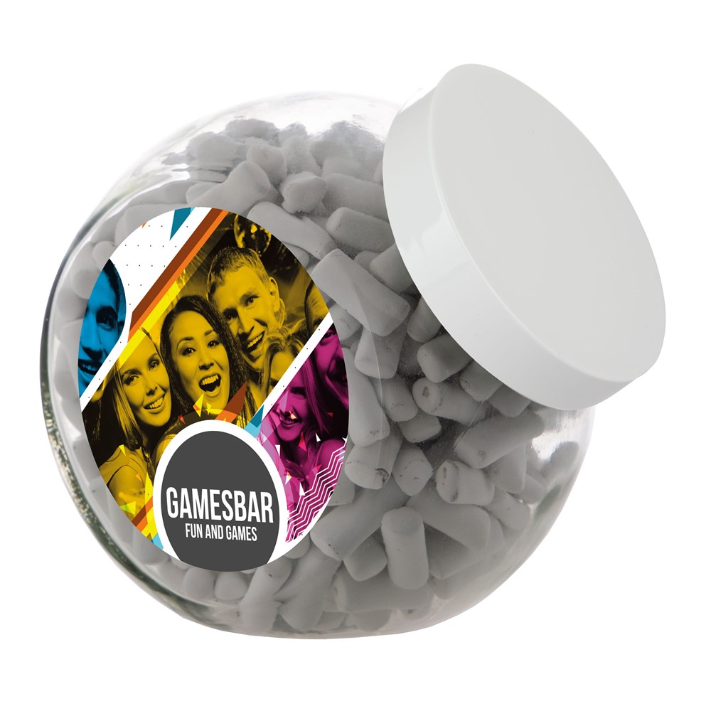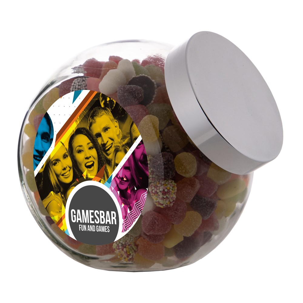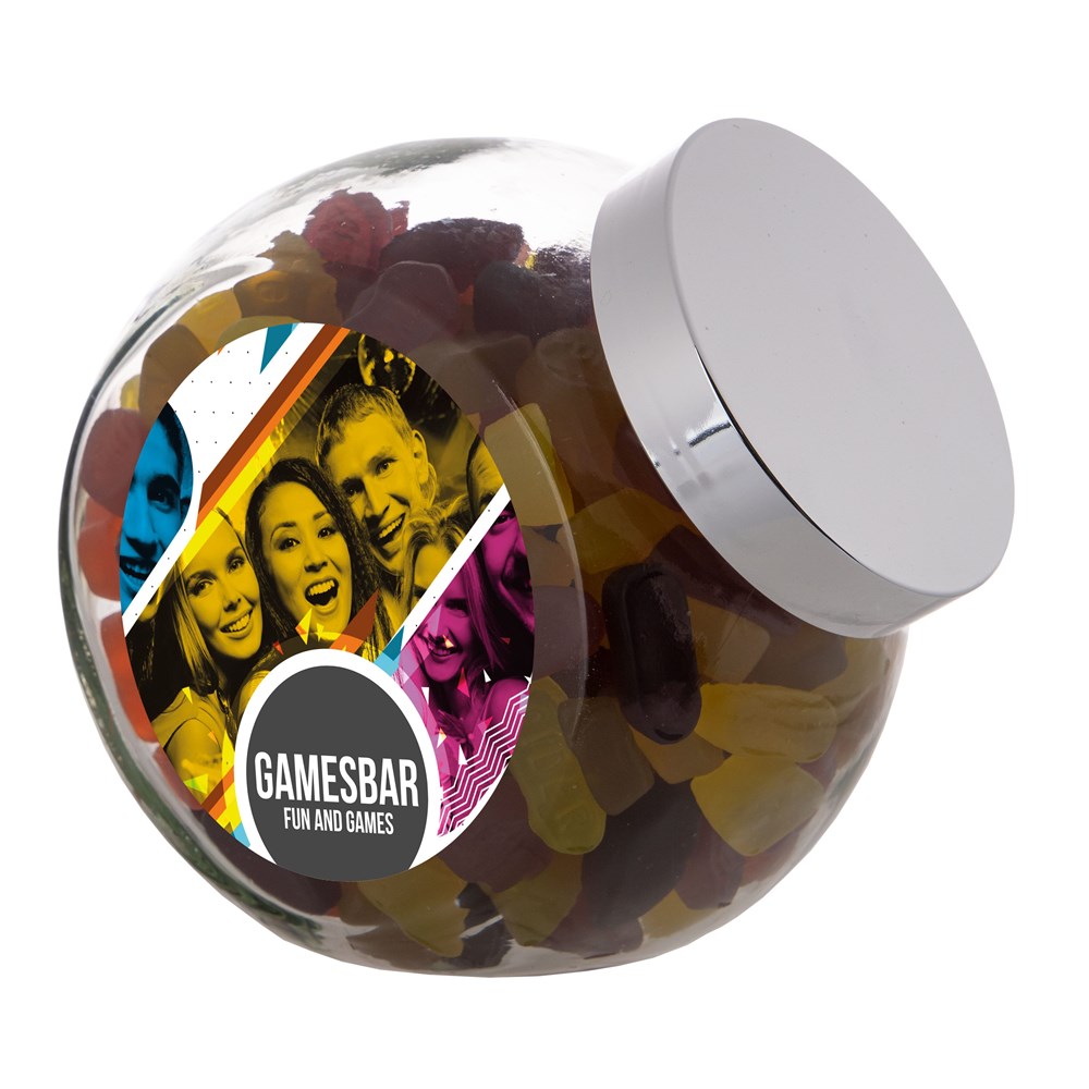 Grote glazen pot 2 liter voorzien van een full colour sticker op beide zijden, gevuld met snoepDrukoppervlak:
