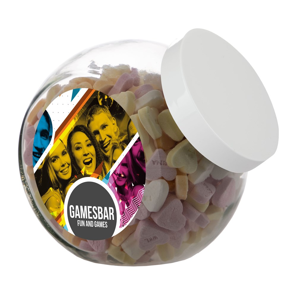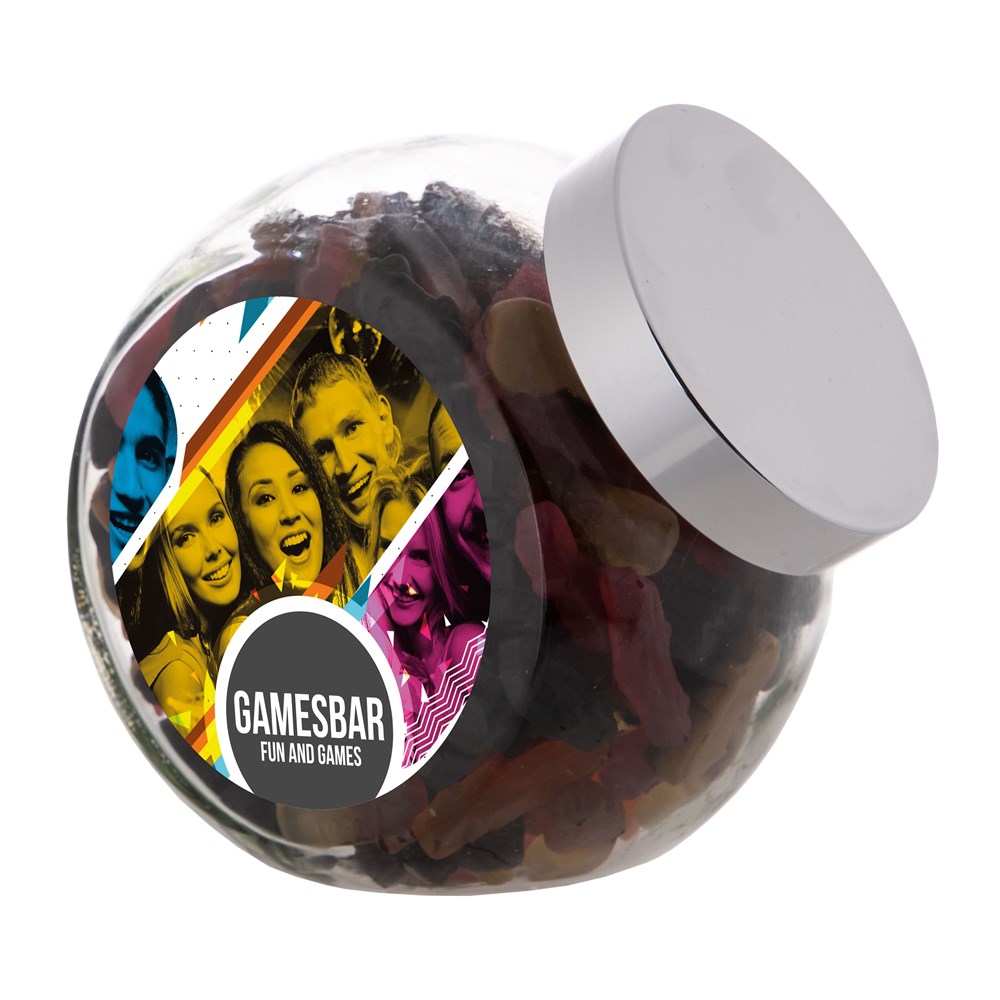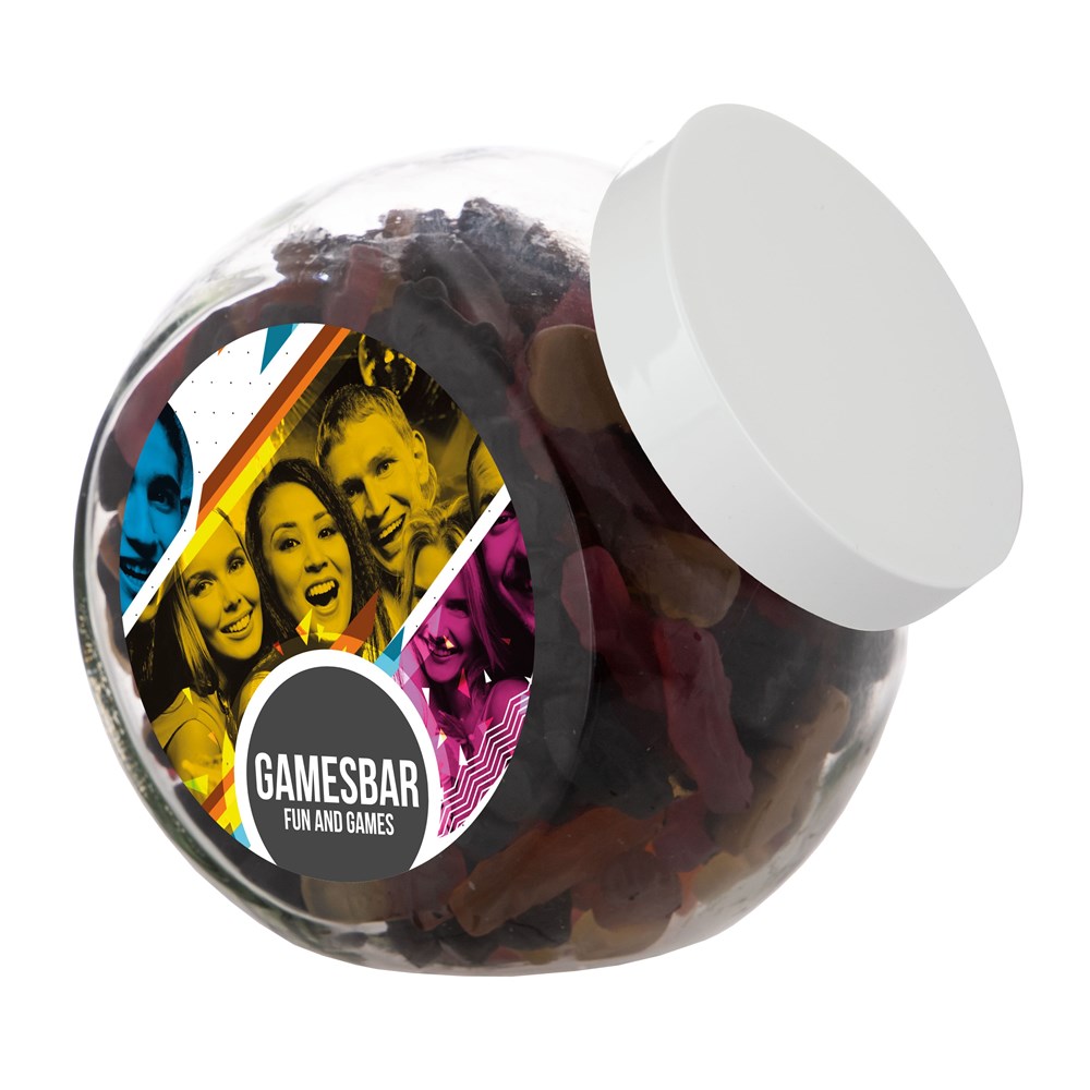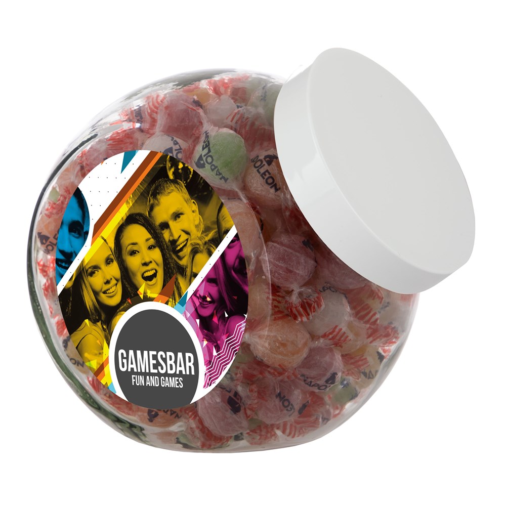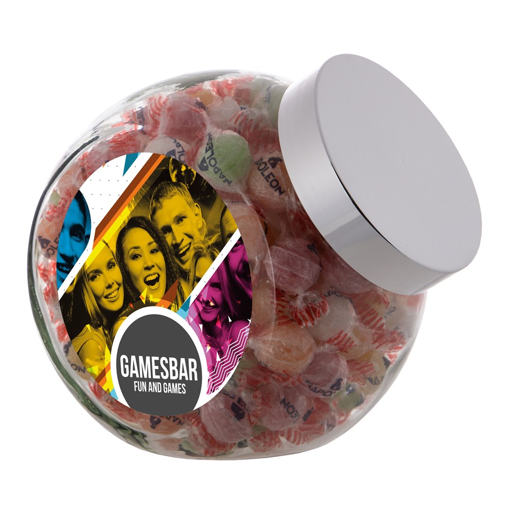 Grote glazen pot 2 liter voorzien van een full colour sticker op beide zijden, gevuld met snoepDrukoppervlak: