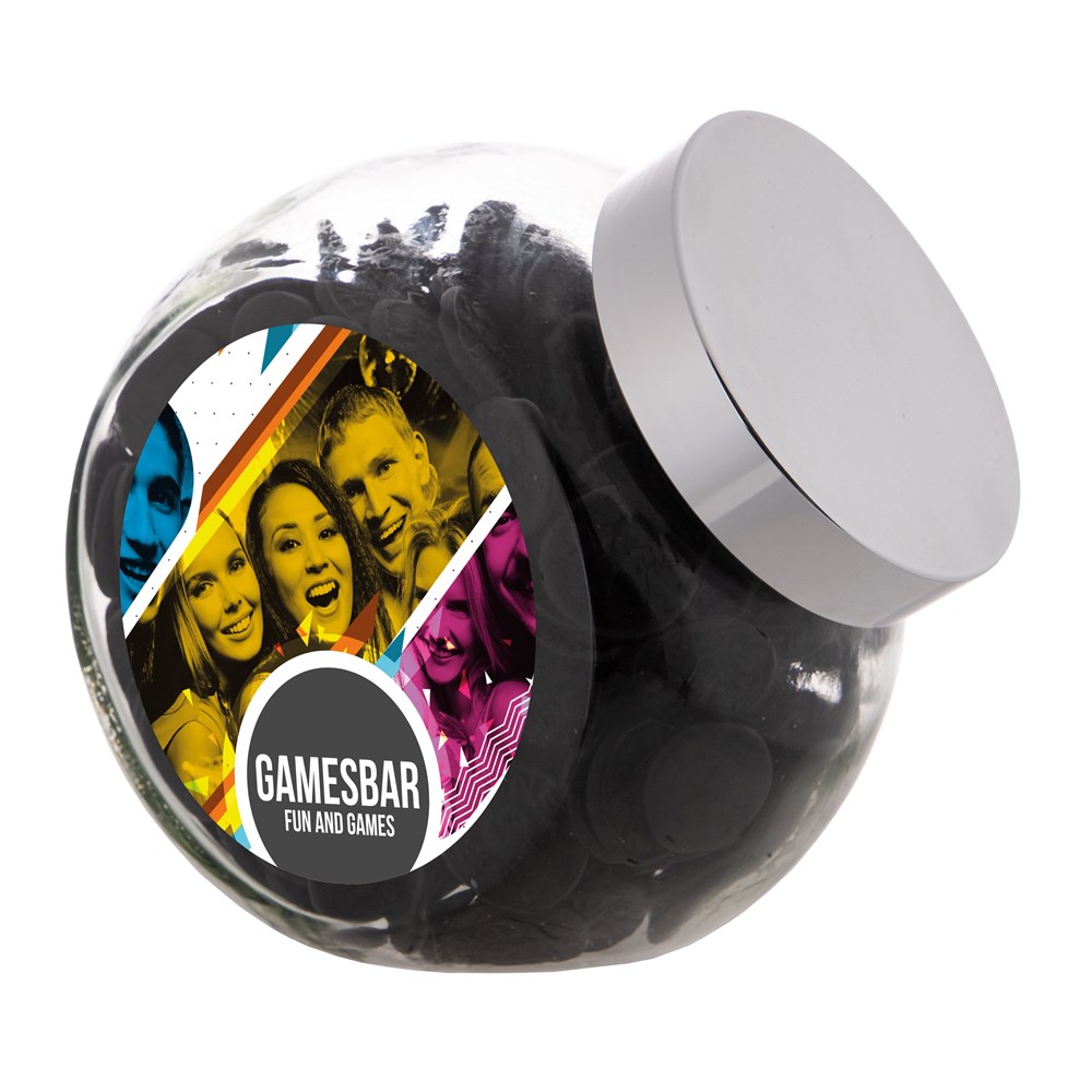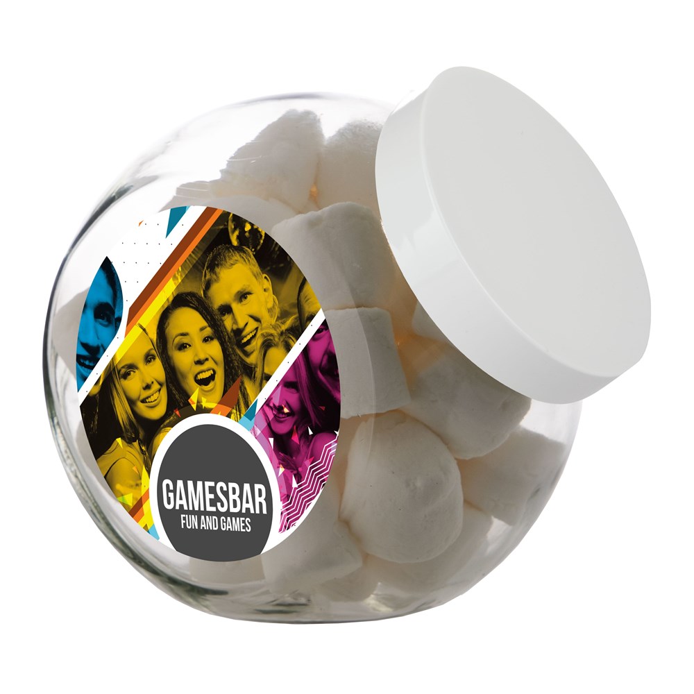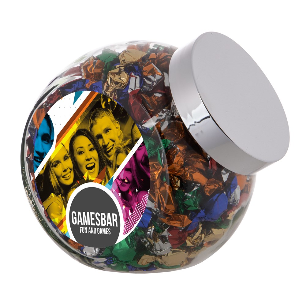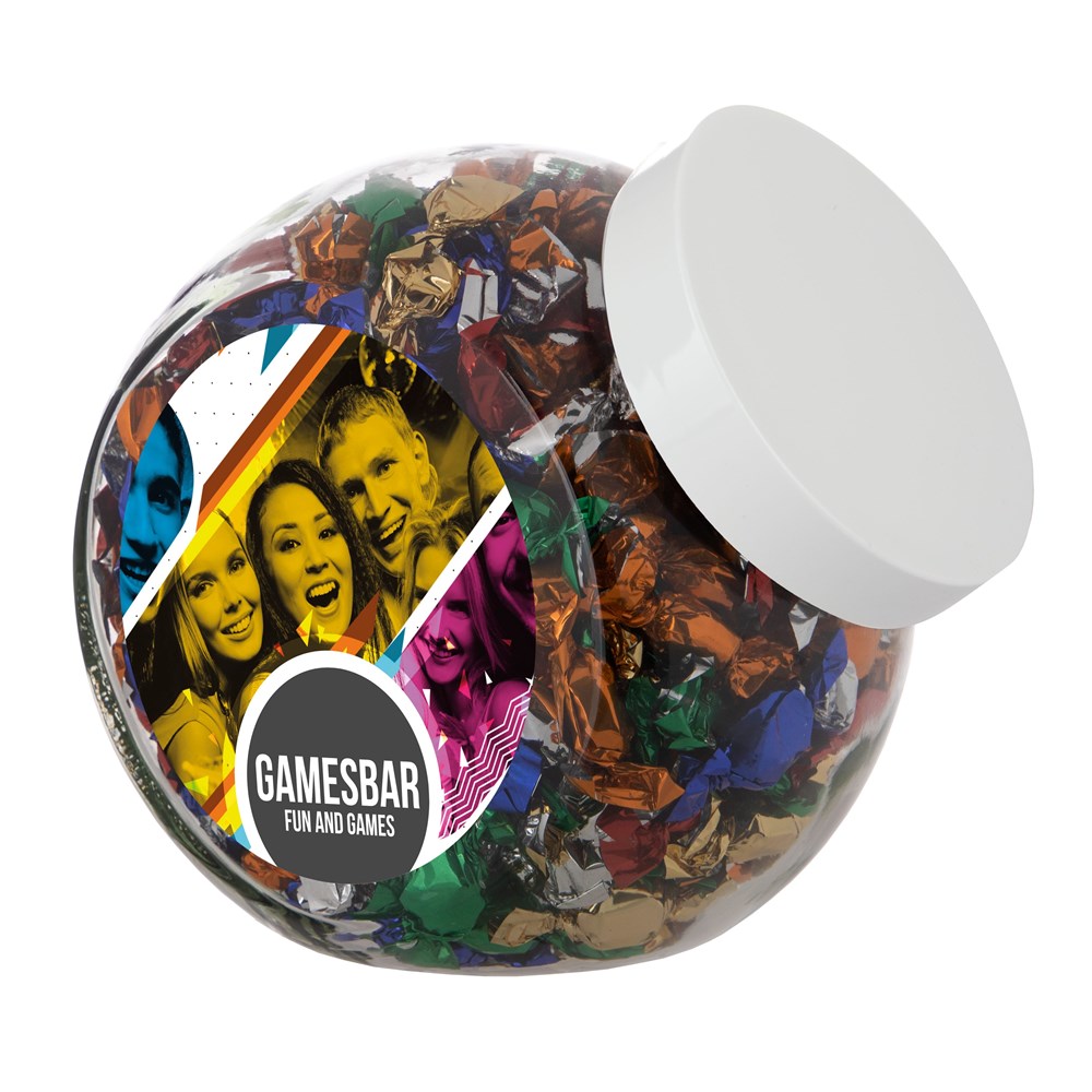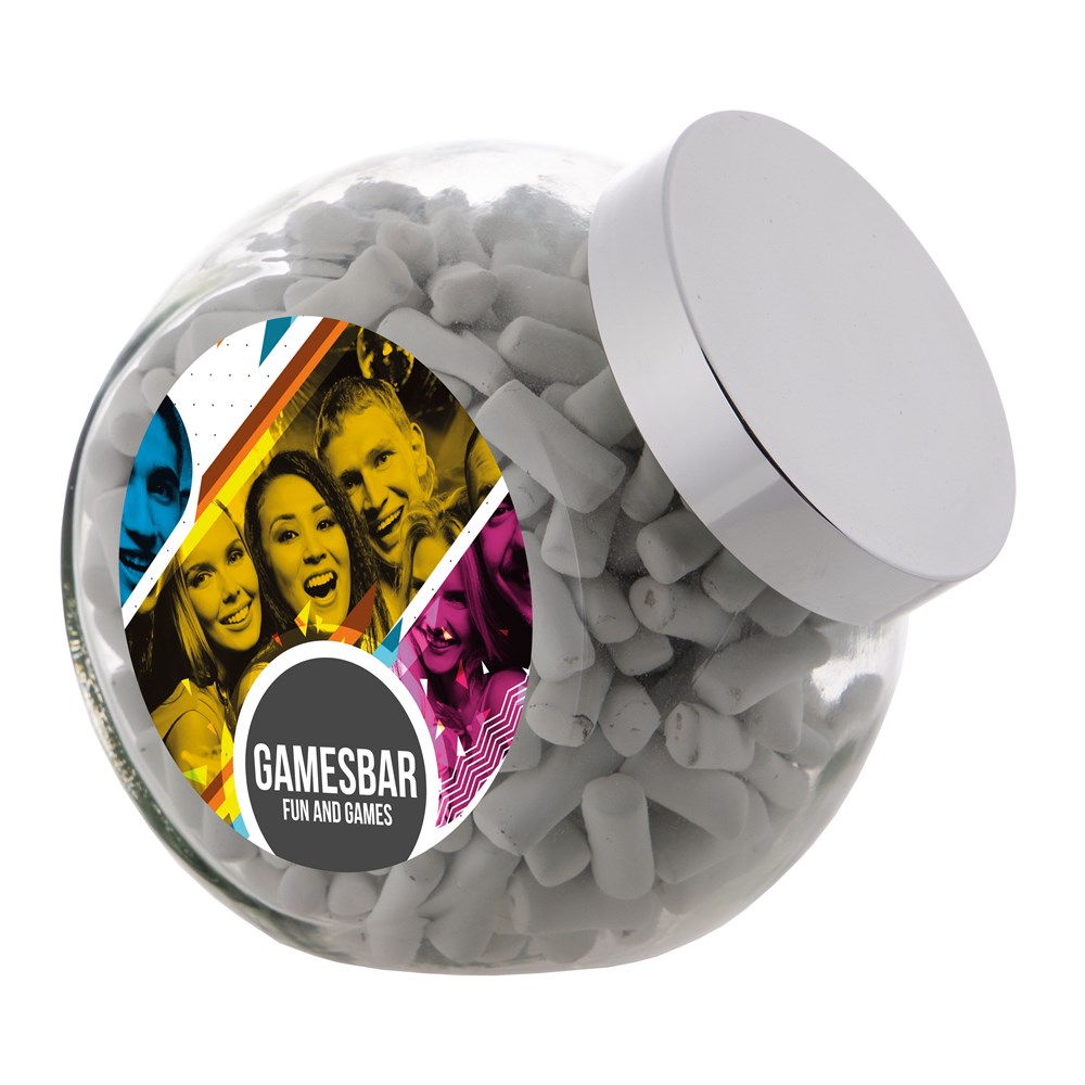 Grote glazen pot 2 liter voorzien van een full colour sticker op beide zijden, gevuld met snoepDrukoppervlak: