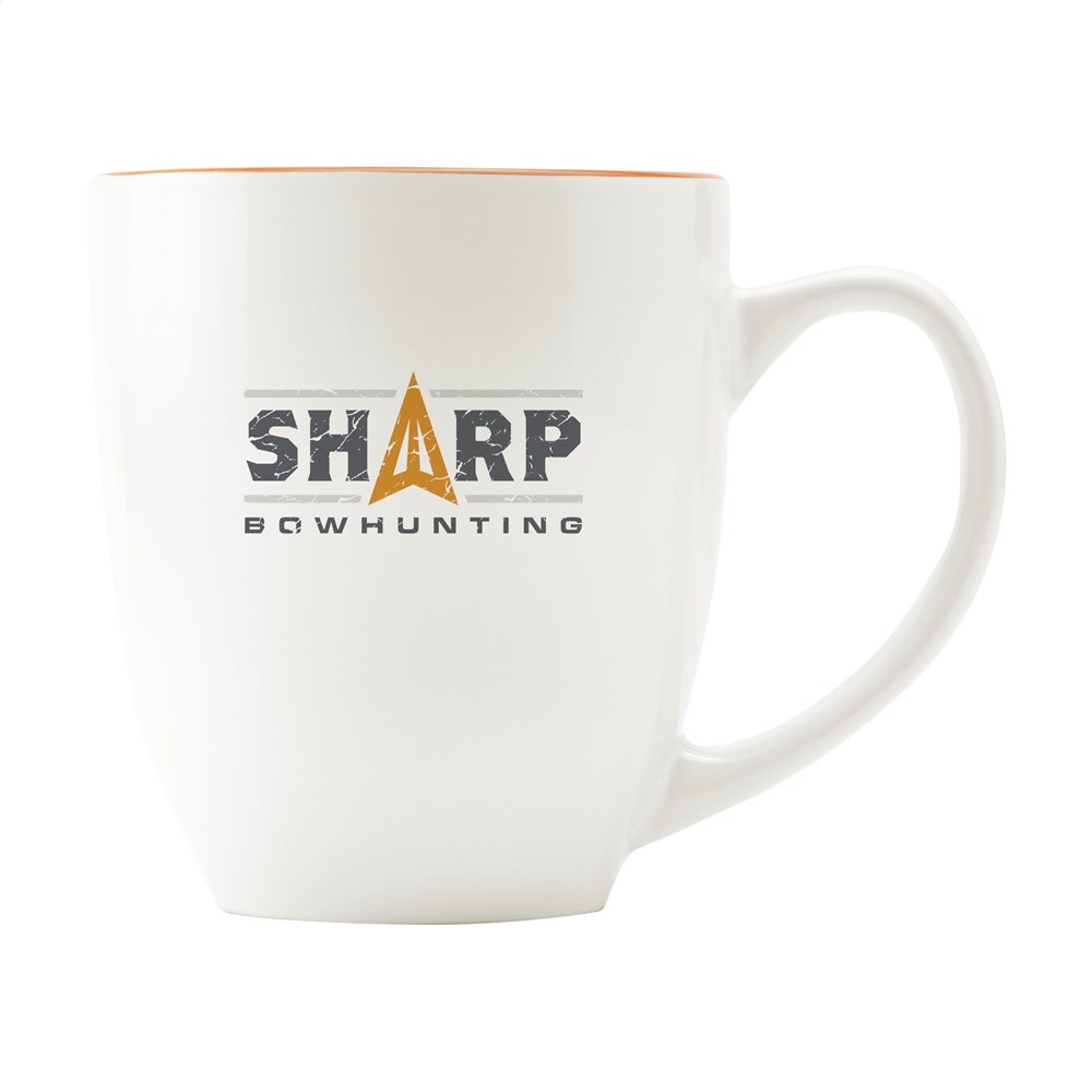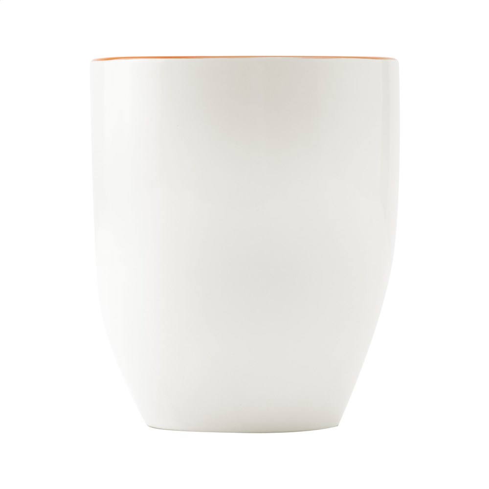 Extra grote mok van hoogwaardig keramiek. In geheel wit óf met een opvallend gekleurde binnenzijde. Inhoud 450 ml. Vaatwasserbestendig. De opdruk is vaatwasmachine getest en gecertificeerd: EN 12875-2.Drukoppervlak: