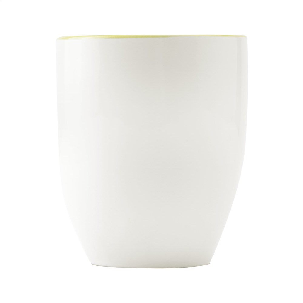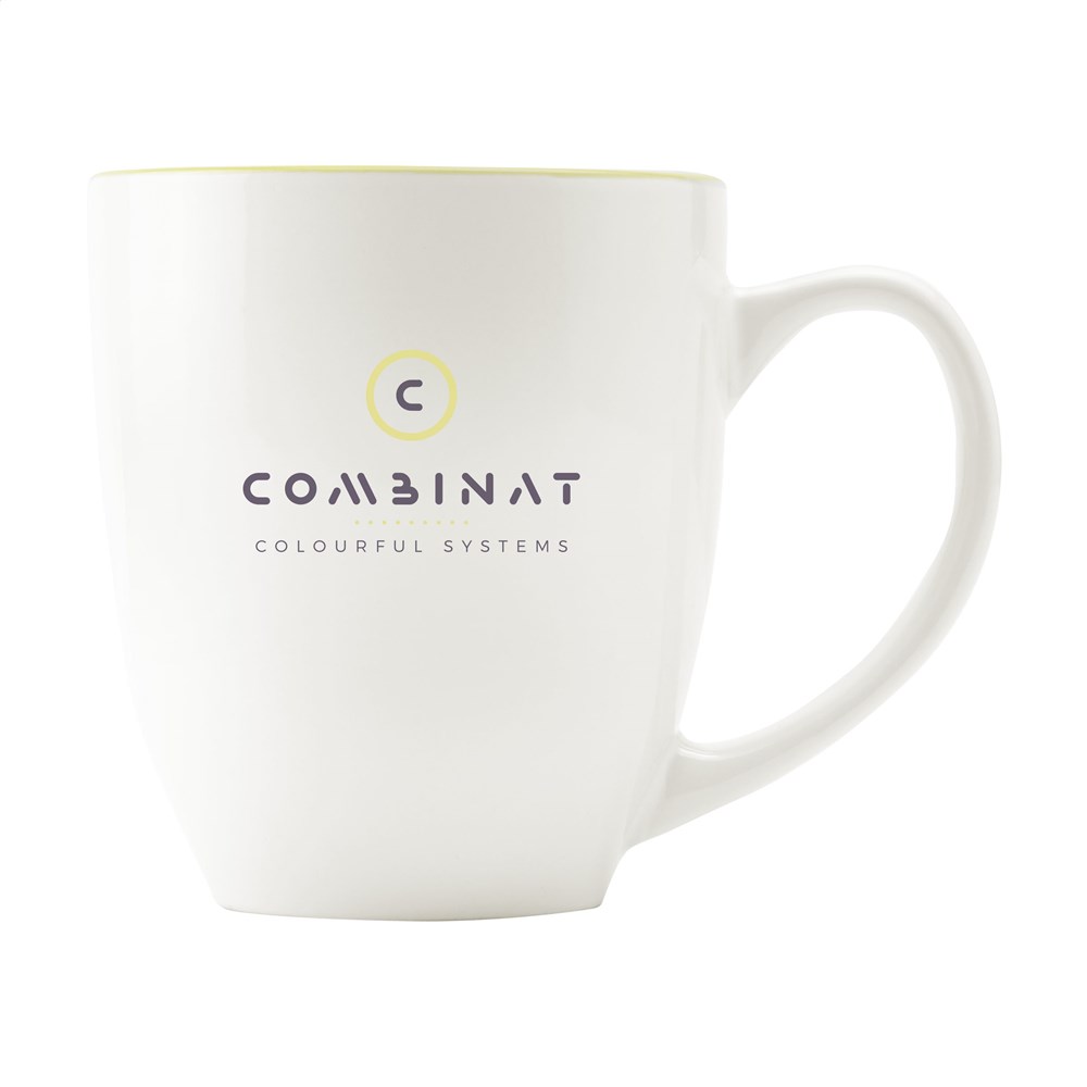 Extra grote mok van hoogwaardig keramiek. In geheel wit óf met een opvallend gekleurde binnenzijde. Inhoud 450 ml. Vaatwasserbestendig. De opdruk is vaatwasmachine getest en gecertificeerd: EN 12875-2.Drukoppervlak: