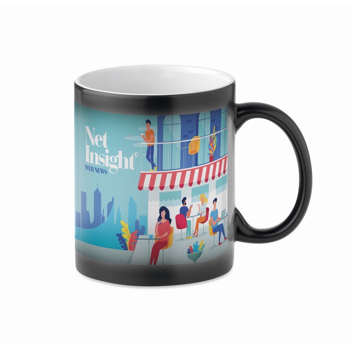 Keramische mok met speciale coating voor sublimatie. Door een speciale coating op het oppervlak van de mok, verkleurd de mok wanneer 40-50 ℃ vloeistof in de mok wordt gegoten. Wanneer de speciale coating transparant wordt, verschijnen uw ontwerp hieronder. Per stuk verpakt in wit kartonnen doosje.