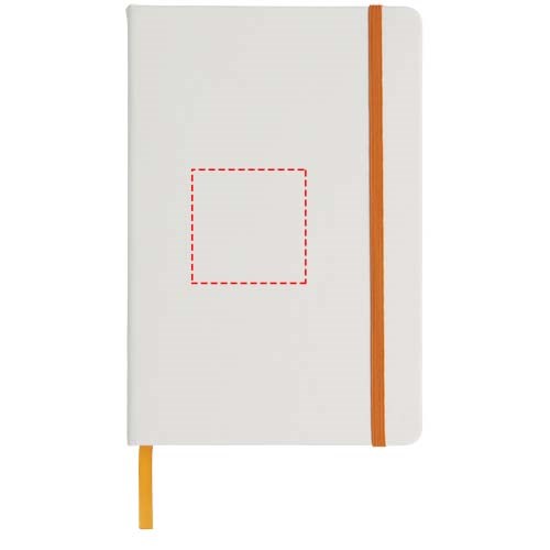 Witte A5 notitieboek met gekleurde elastische sluiting en lint. Inclusief 80 vellen (60 g / m2) gelinieerd papier. Digitaal printen mogelijk op omslag.Drukoppervlak: