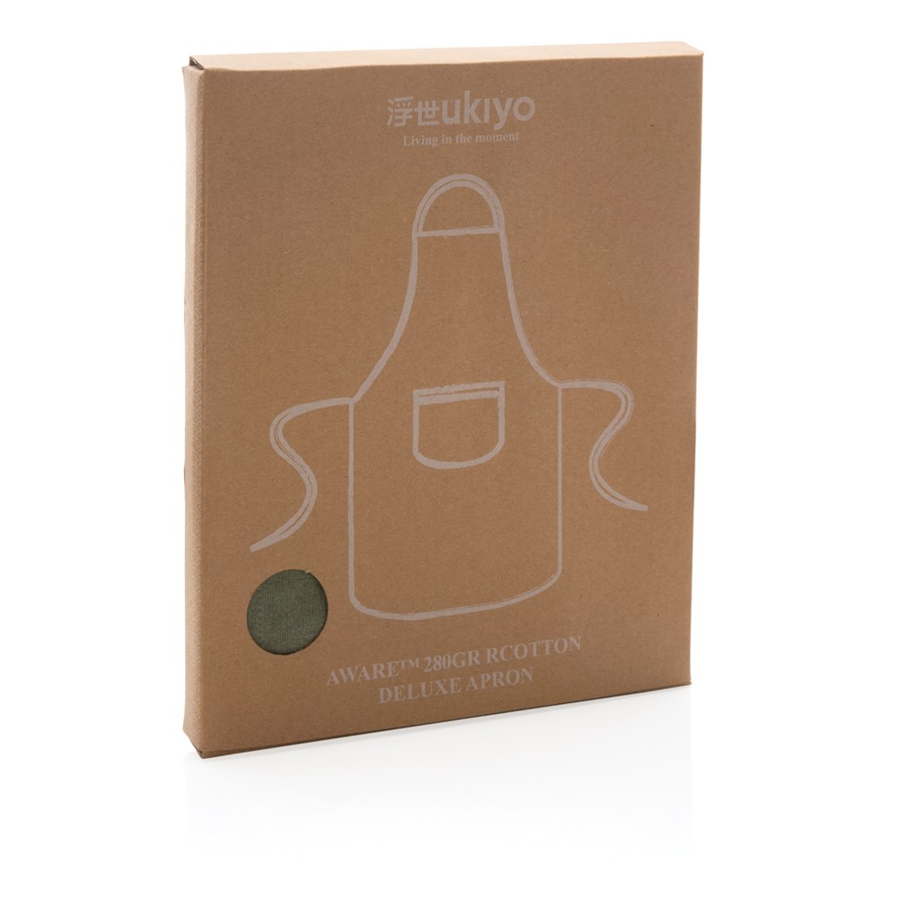 Het Ukiyo Aware™ 280gr recycled katoenen deluxe schort is zorgvuldig ontworpen om te voldoen aan de behoeften van een moderne, alledaagse keuken zonder in te boeten aan schoonheid of plezier. Het one-size ontwerp voor alle lichaamstypes en maten. De verstelbare banden zorgen voor de juiste pasvorm. In het voorvak kun je je benodigde spullen kwijt. Het schort is gemaakt van gerecycled katoen met AWARE™ tracer die het echte gebruik van gerecyclede materialen valideert. Elk schort bespaart 1394.4 liter water. 2% van de opbrengst van elk verkocht product dat AWARE™ bevat, wordt gedoneerd aan Water.org.Drukoppervlak: