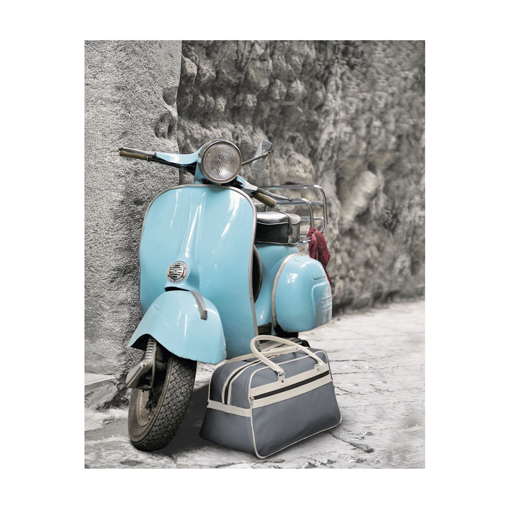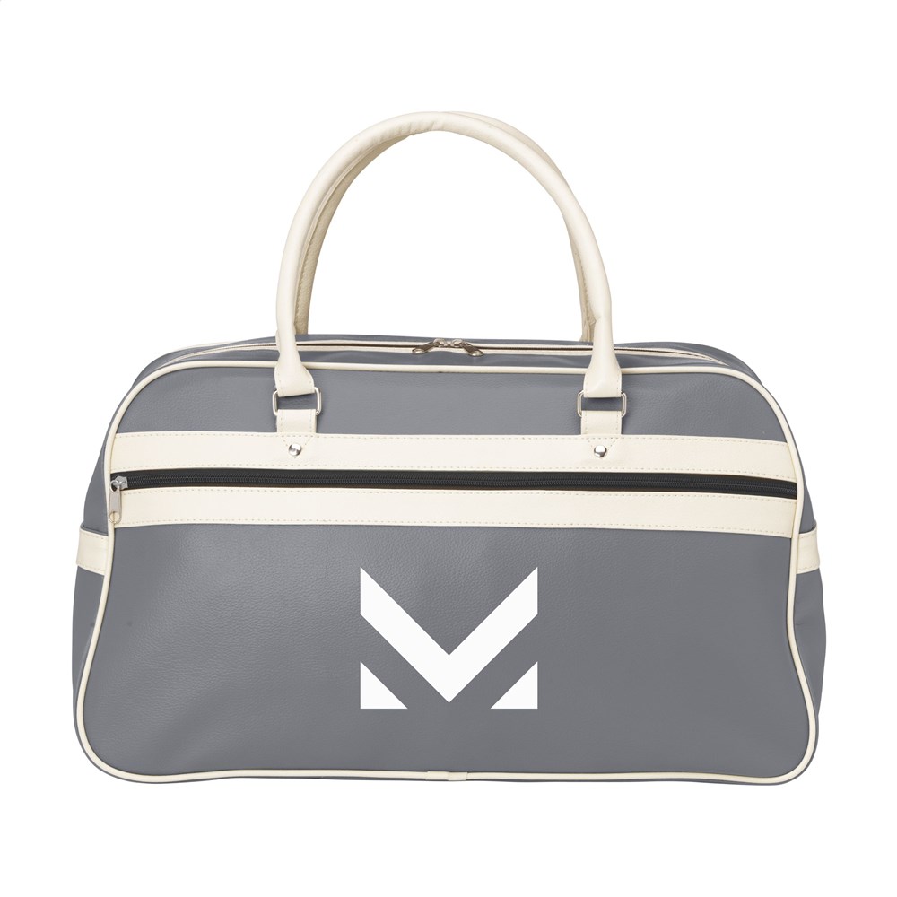 PVC/PU sporttas in jaren '70 look met gevoerde binnenzijde, hoofdvak en ritsvak, 2 stevige handgrepen, inlegbodem en beschermnoppen. Afgewerkt met hoogwaardige materialen die een lange levensduur garanderen. Inhoud ca. 21,5 ltr.Drukoppervlak: