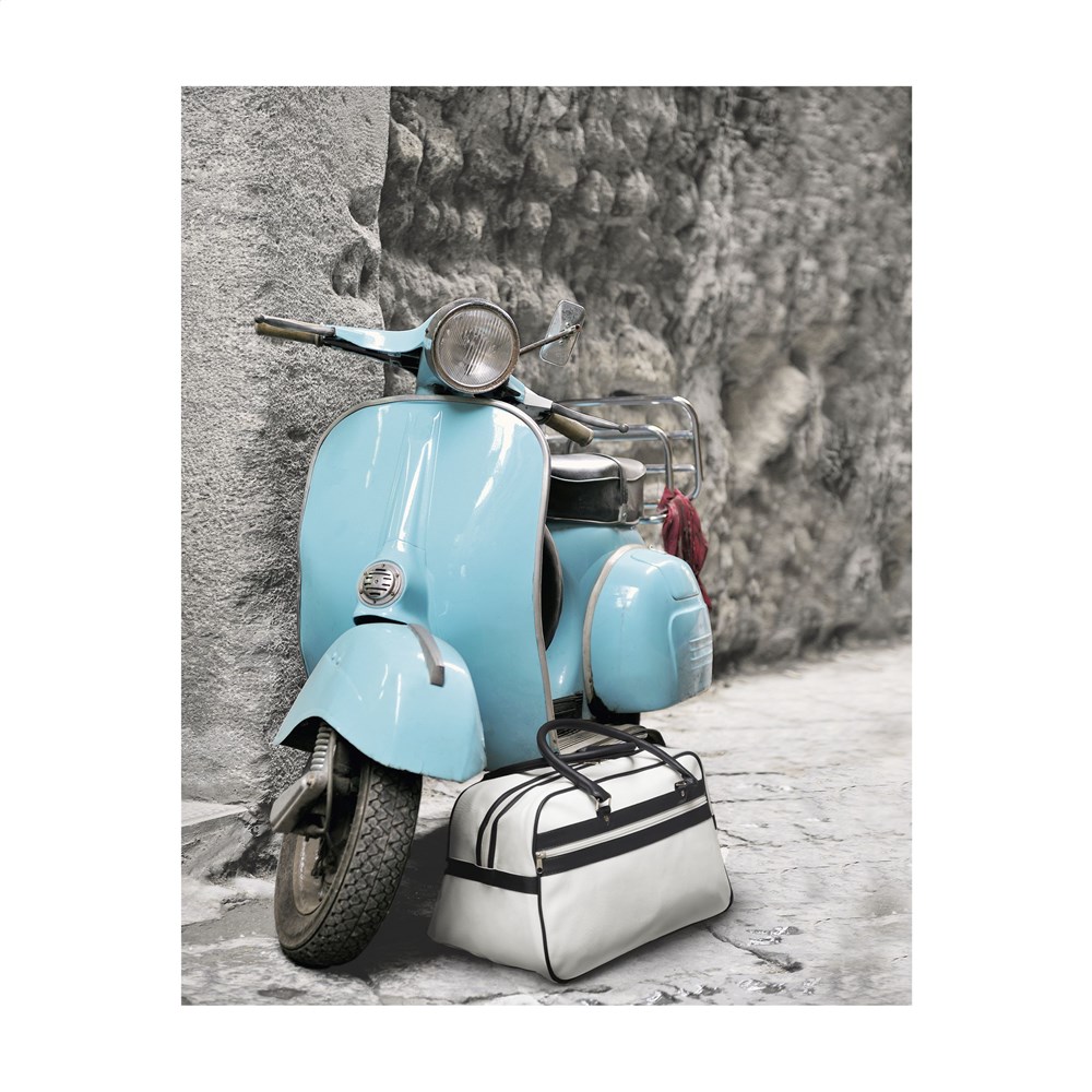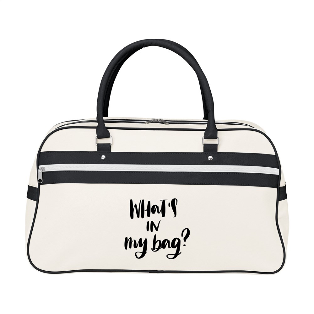 PVC/PU sporttas in jaren '70 look met gevoerde binnenzijde, hoofdvak en ritsvak, 2 stevige handgrepen, inlegbodem en beschermnoppen. Afgewerkt met hoogwaardige materialen die een lange levensduur garanderen. Inhoud ca. 21,5 ltr.Drukoppervlak: