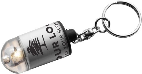 Sleutelhanger met kunststof concertlampje, incl. batterijen. Bedrukking op de bijgesloten wikkel.