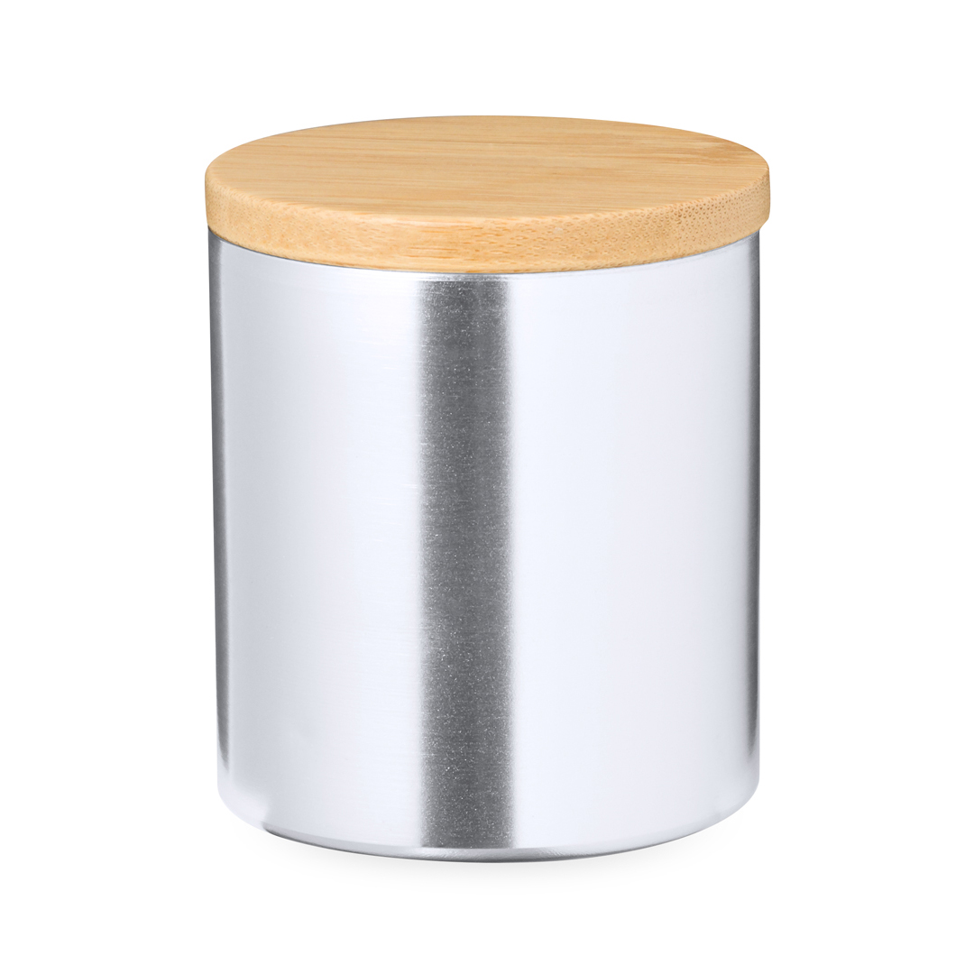 Vanille geurkaars. Gepresenteerd in een metalen pot met een deksel van bamboe.