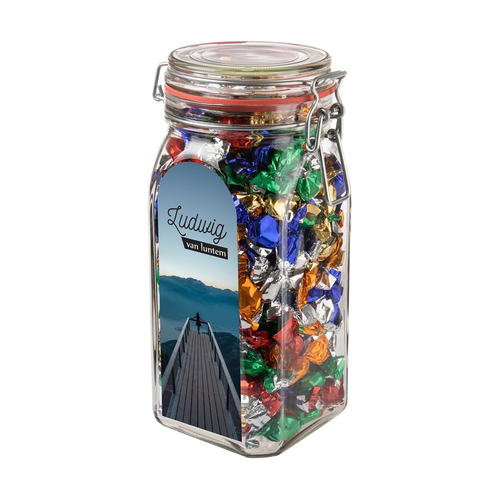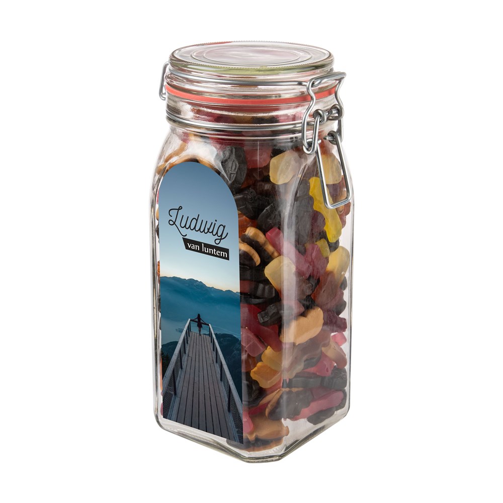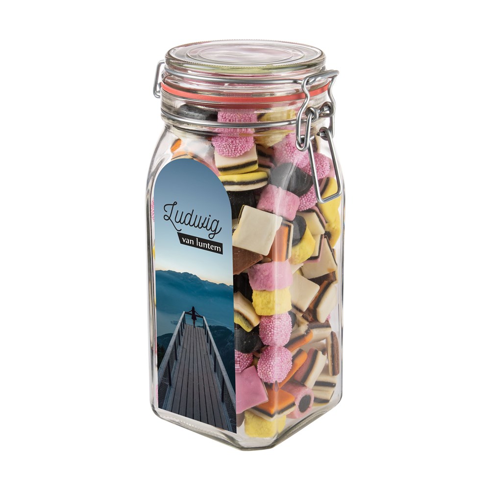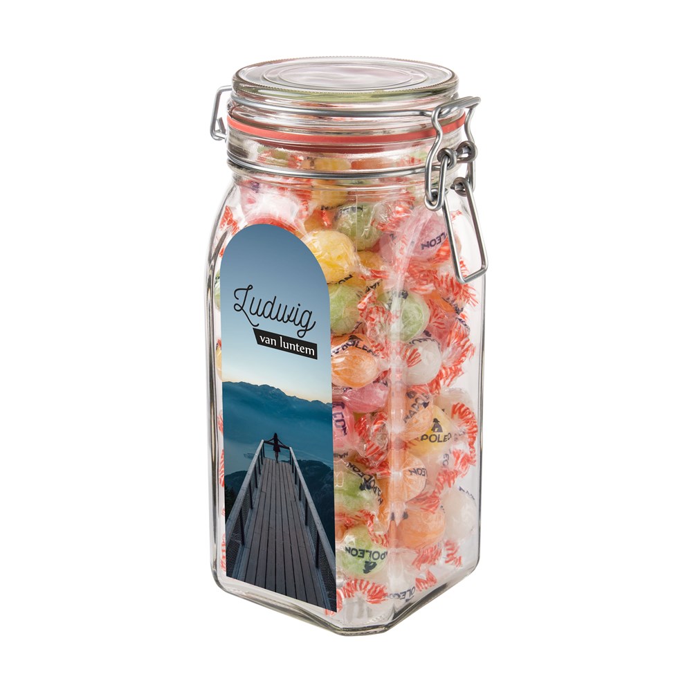 Ouderwetse weckpot gevuld met heerlijk snoepgoed, waarbij u de keuze heeft uit diverse vullingen. De weckpot wordt voorzien van een full colour bedrukte sticker op de voorzijde.